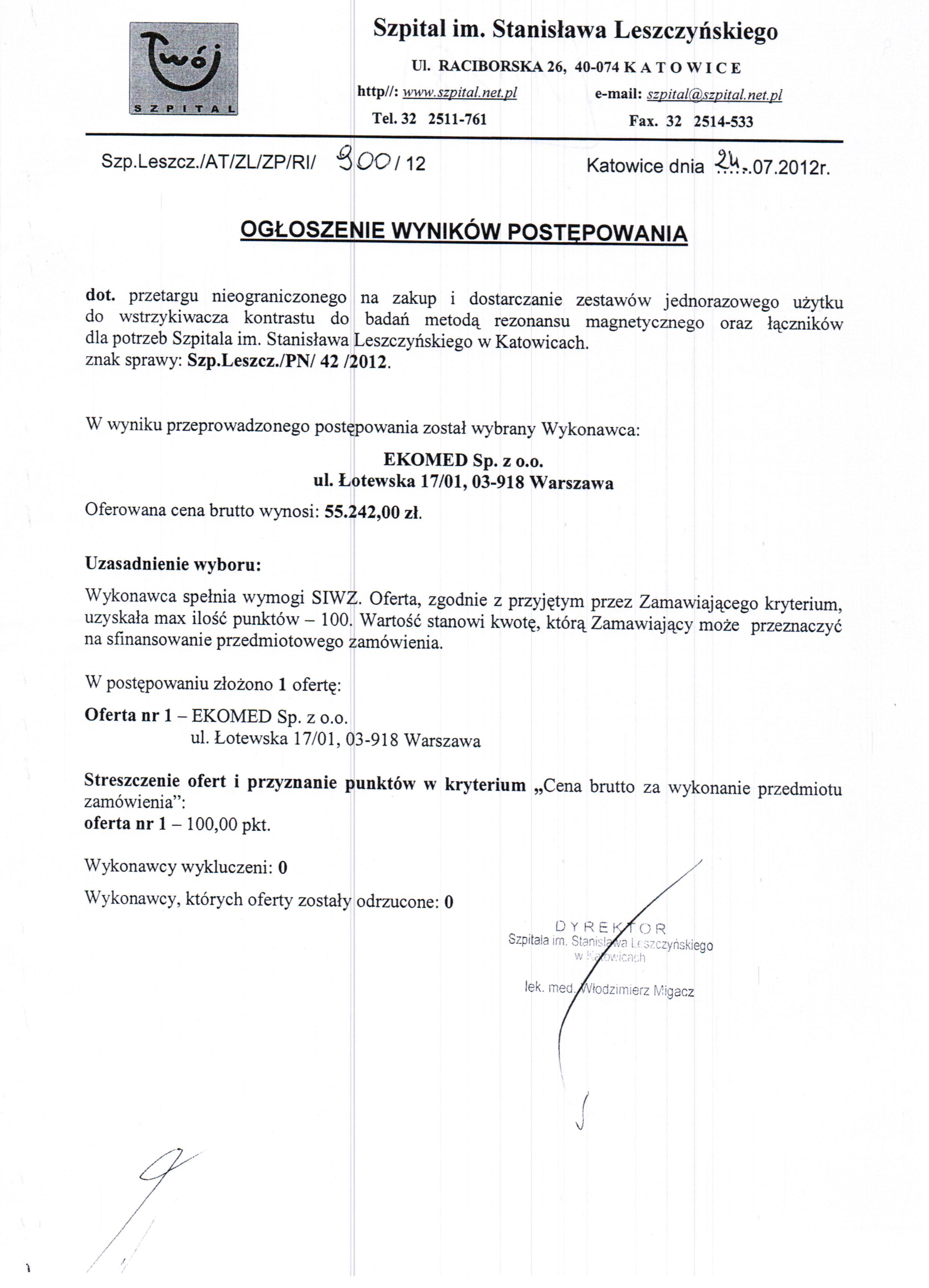 w dniu 19.07.2012r. o godz. 11:00 w Szpitalu im. Stanisława Leszczyńskiego w Katowicach ul. Raciborska 28, budynek Przychodni, II piętro, Sekcja Zamówień Publicznych.