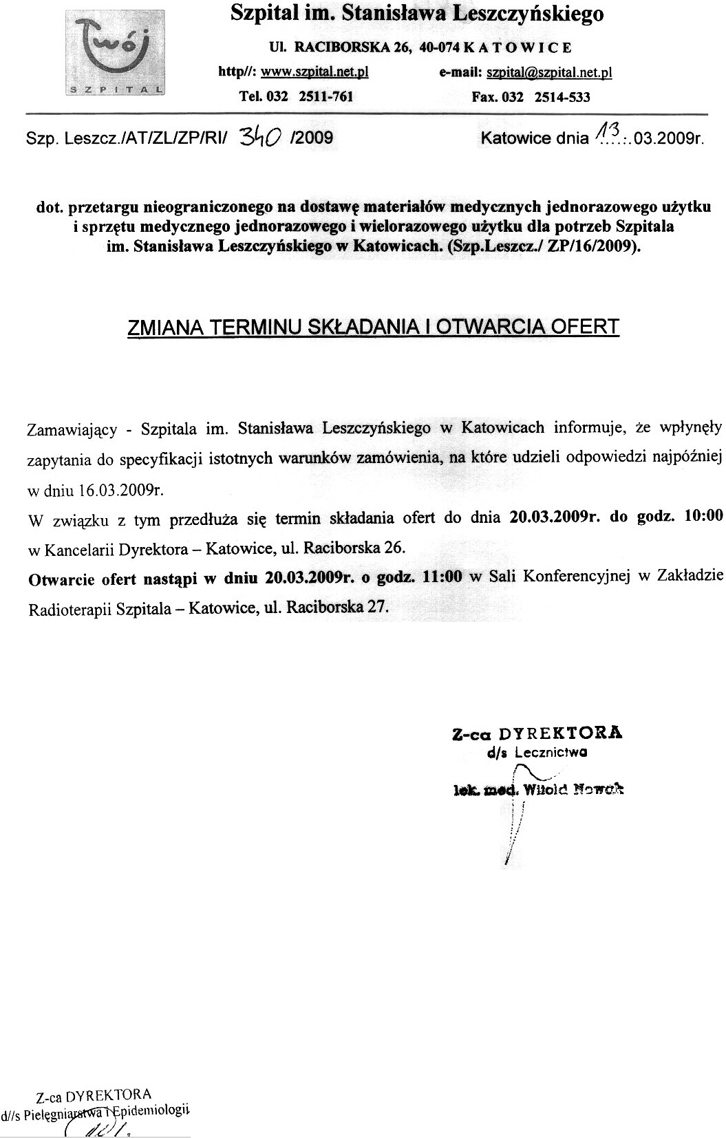 Oferty należy złożyć do dnia 17.03.2009r. do godz. 10:00 w Kancelarii Dyrektora Szpitala im. Stanisława Leszczyńskiego w Katowicach, przy ul. Raciborskiej 26.