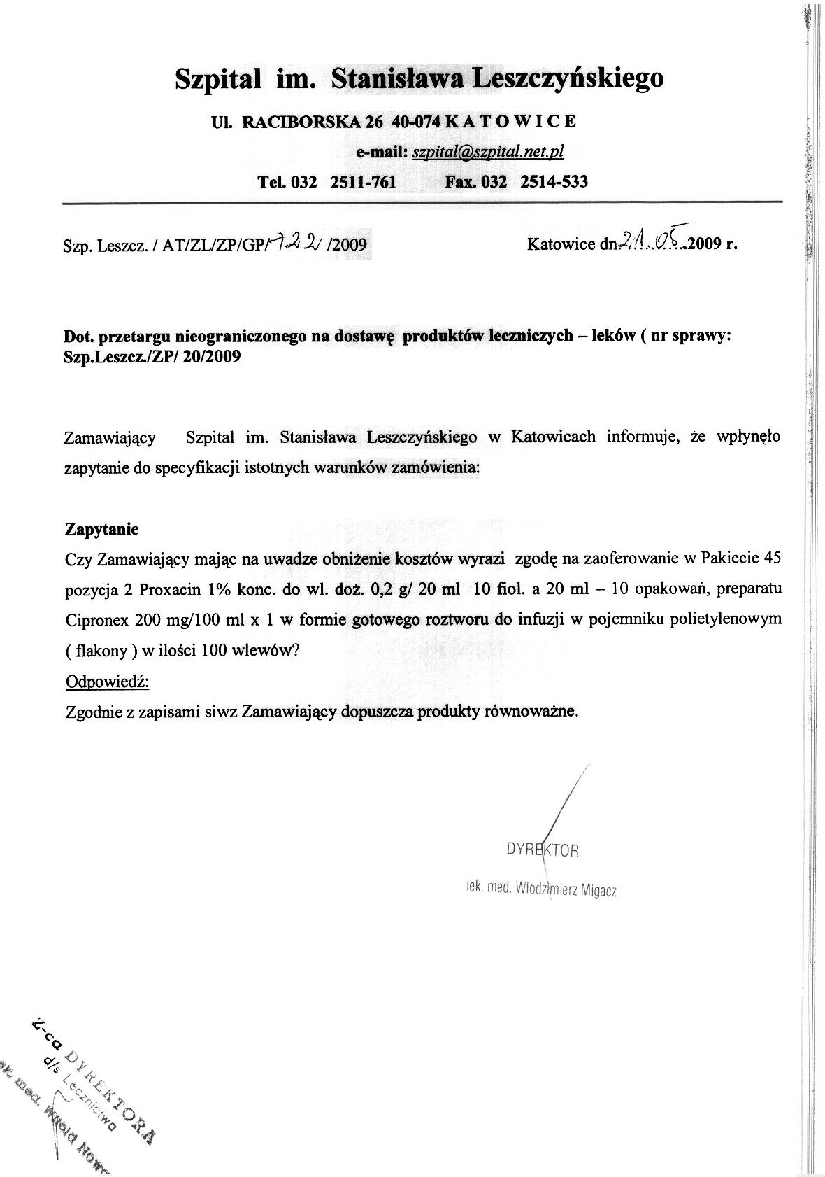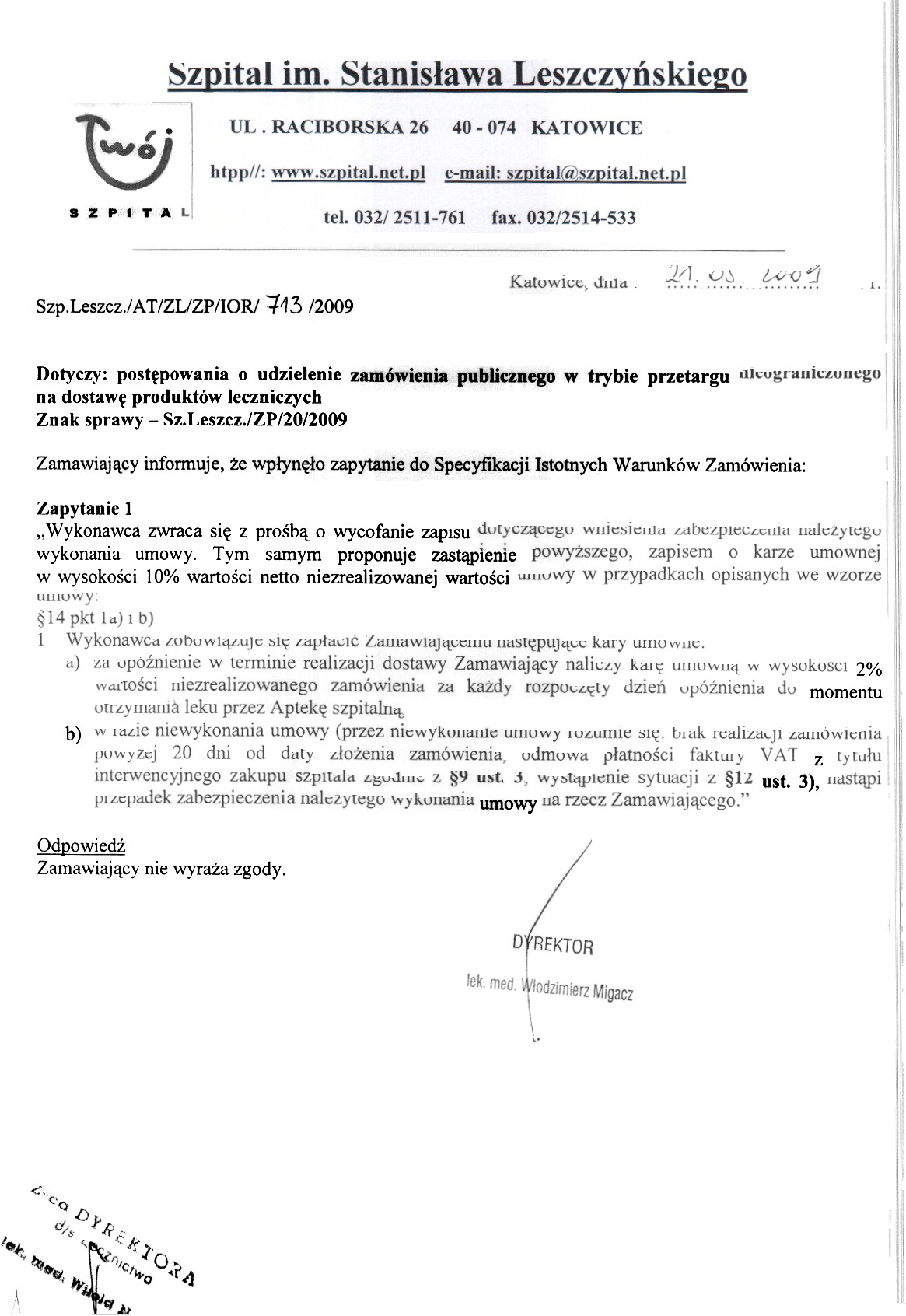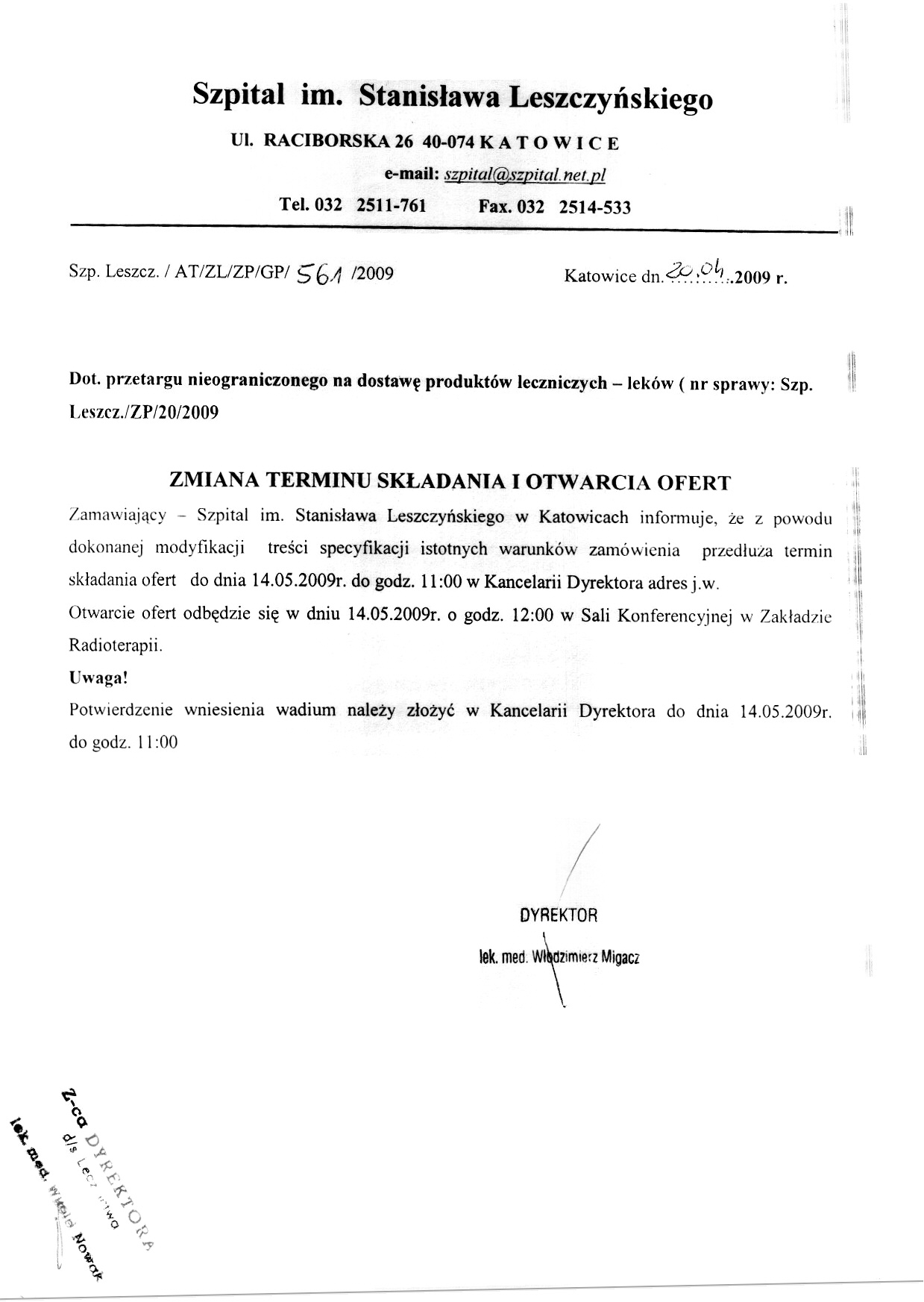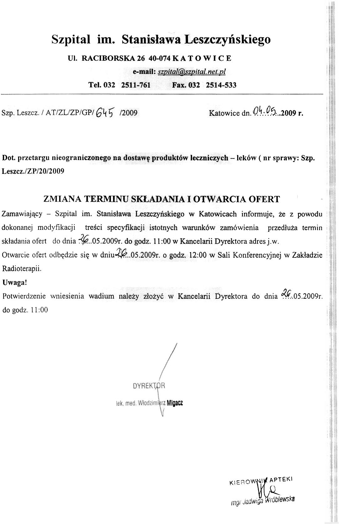 do dnia 05.05.2009r. do godz. 11:00 w Kancelarii Dyrektora Szpitala, w Katowicach, przy ul. Raciborskiej 26.