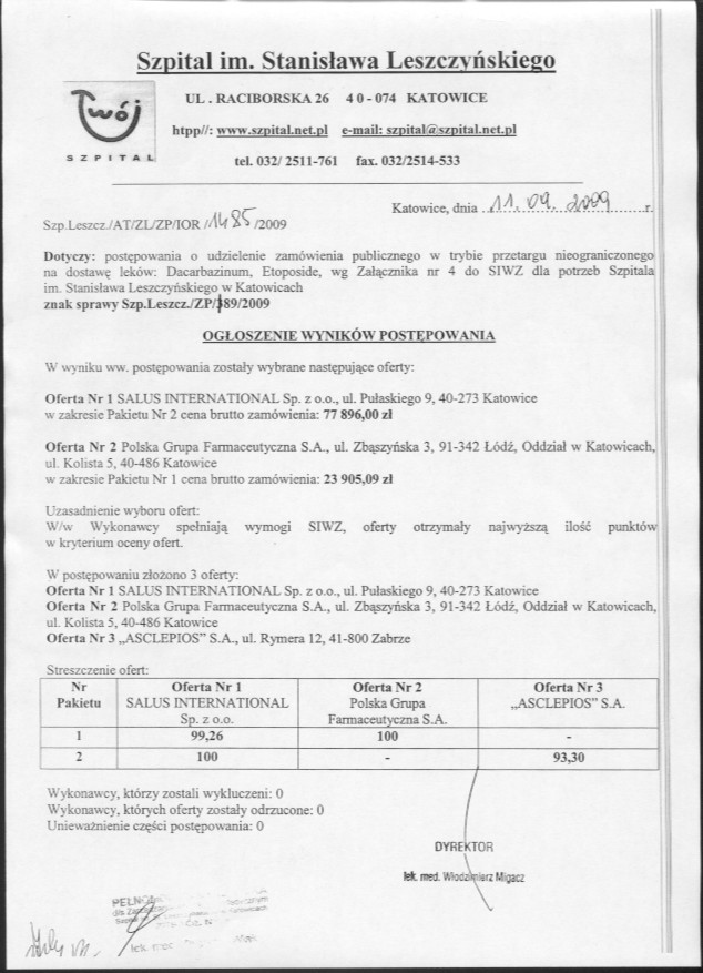 do dnia 03.09.2009r. do godz. 10:00 w Kancelarii Dyrektora Szpitala w Katowicach przy ul. Raciborskiej 26.