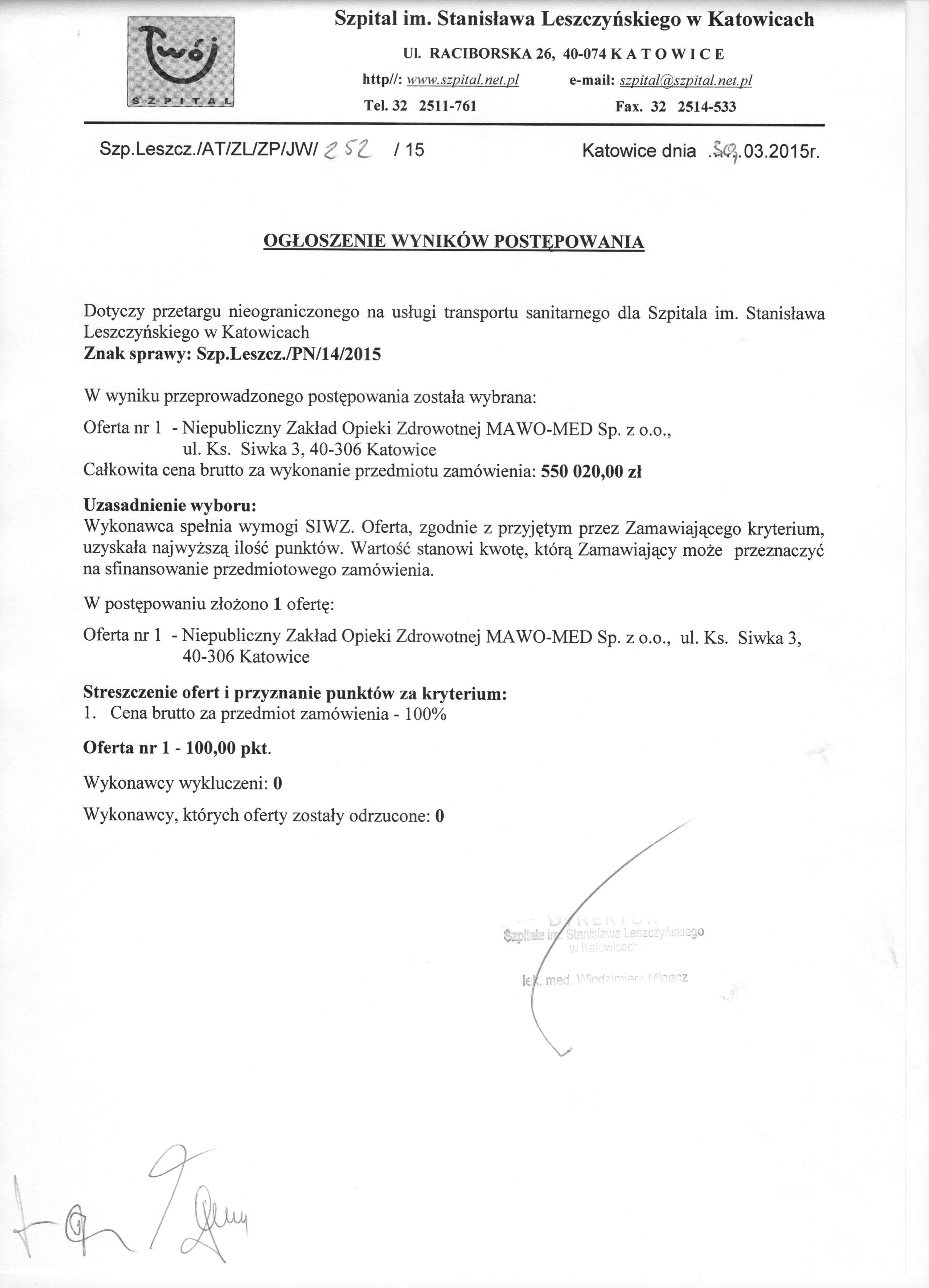 - Dokumentem zlecenia transportu jest Zlecenie lekarskie podpisane ze strony Zamawiającego przez lekarza Szpitala wraz z imienną pieczątką i pieczątką oddziału. Zlecenie bez imiennej pieczątki lekarza jest nieważne.