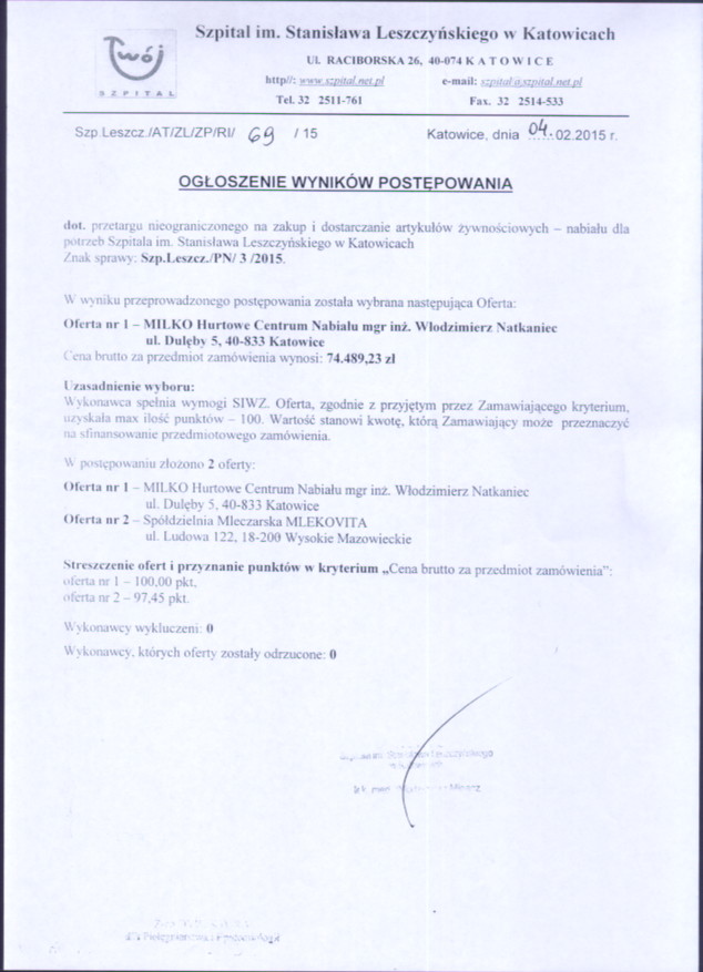 w dniu 30.01.2015 r. o godz. 11:00 w Szpitalu im. Stanisława Leszczyńskiego w Katowicach, ul. Raciborska 28, budynek Przychodni, II piętro, Sekcja Zamówień Publicznych.