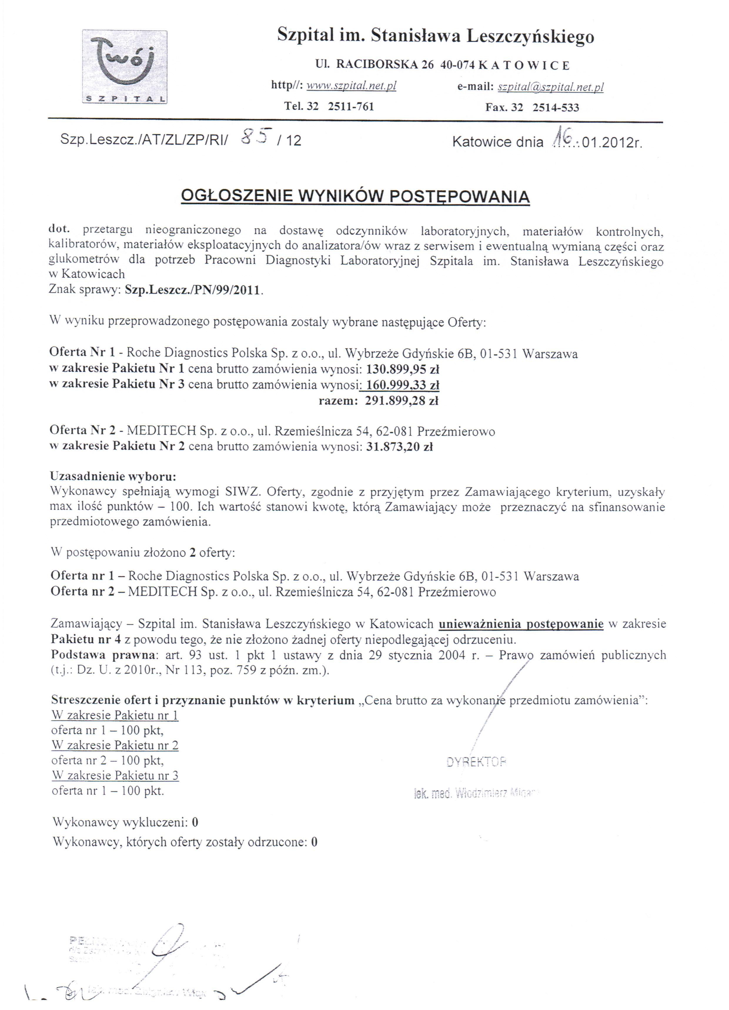 Otwarcie ofert nastąpi w dniu 10.01.2012r. o godz. 11:00 w Szpitalu im. Stanisława Leszczyńskiego
