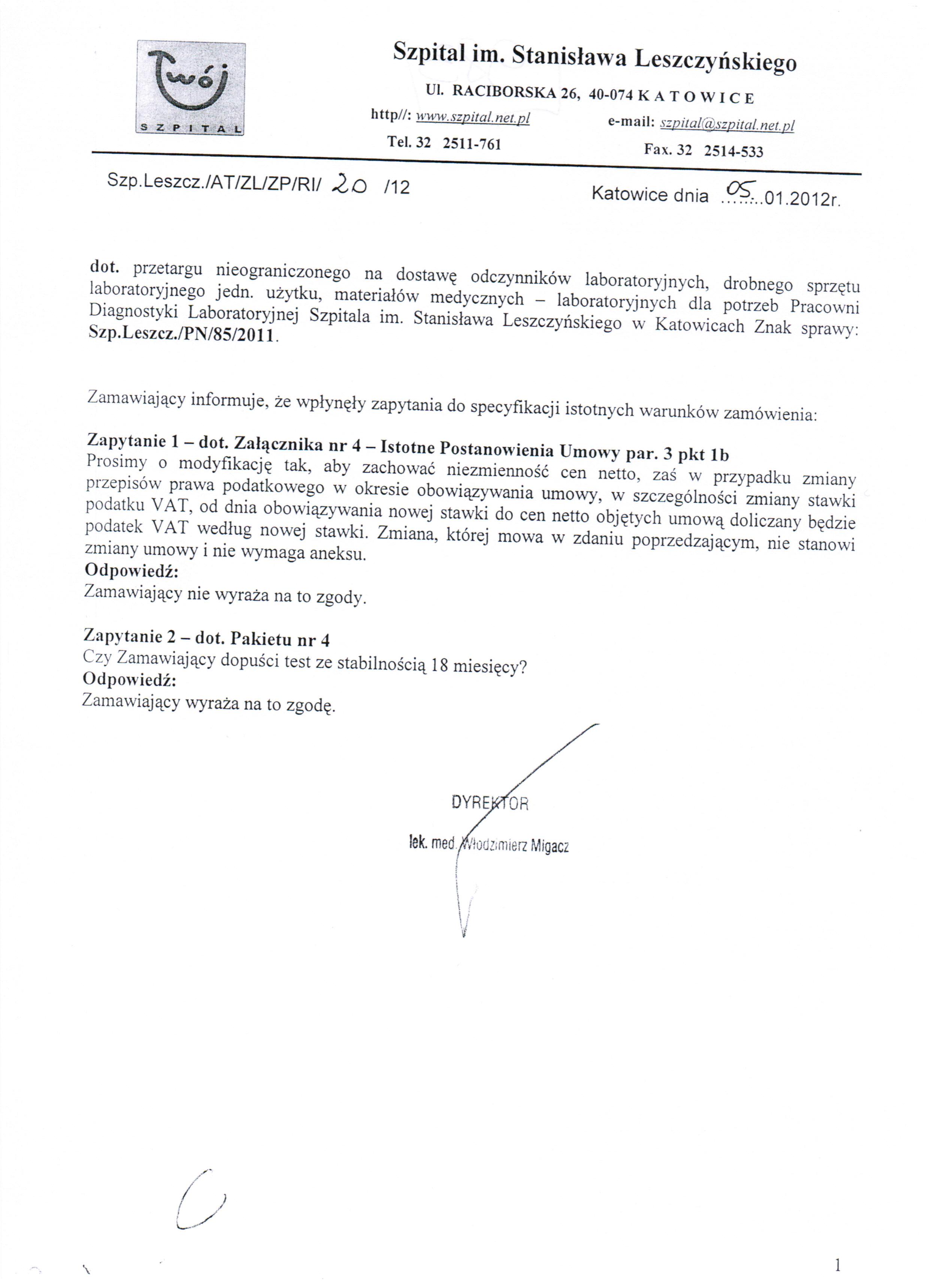 Oferty należy złożyć do dnia 10.01.2012r. do godz. 10:00 w Szpitalu im. Stanisława Leszczyńskiego w Katowicach ul. Raciborska 26 – Kancelaria Dyrektora.