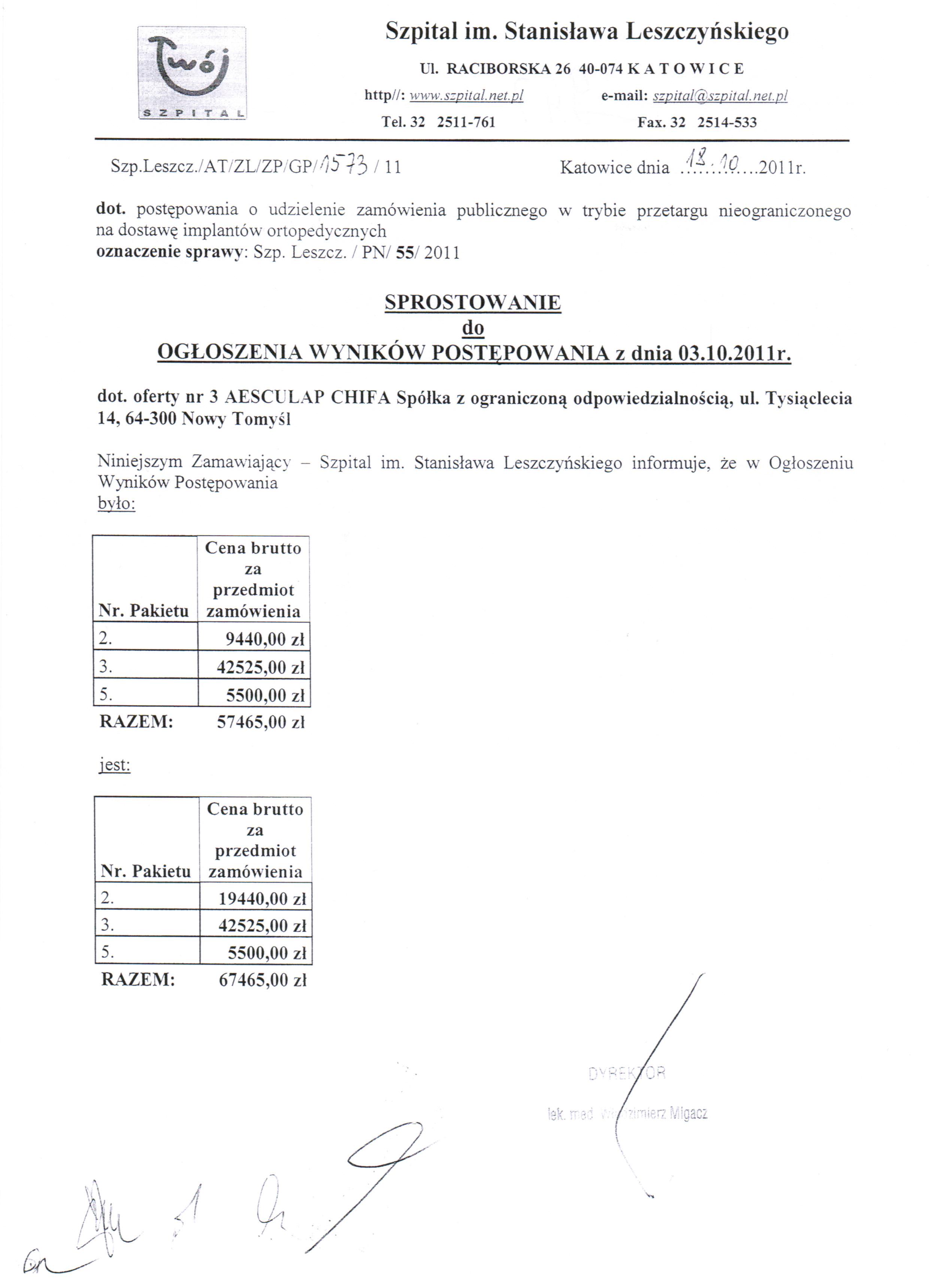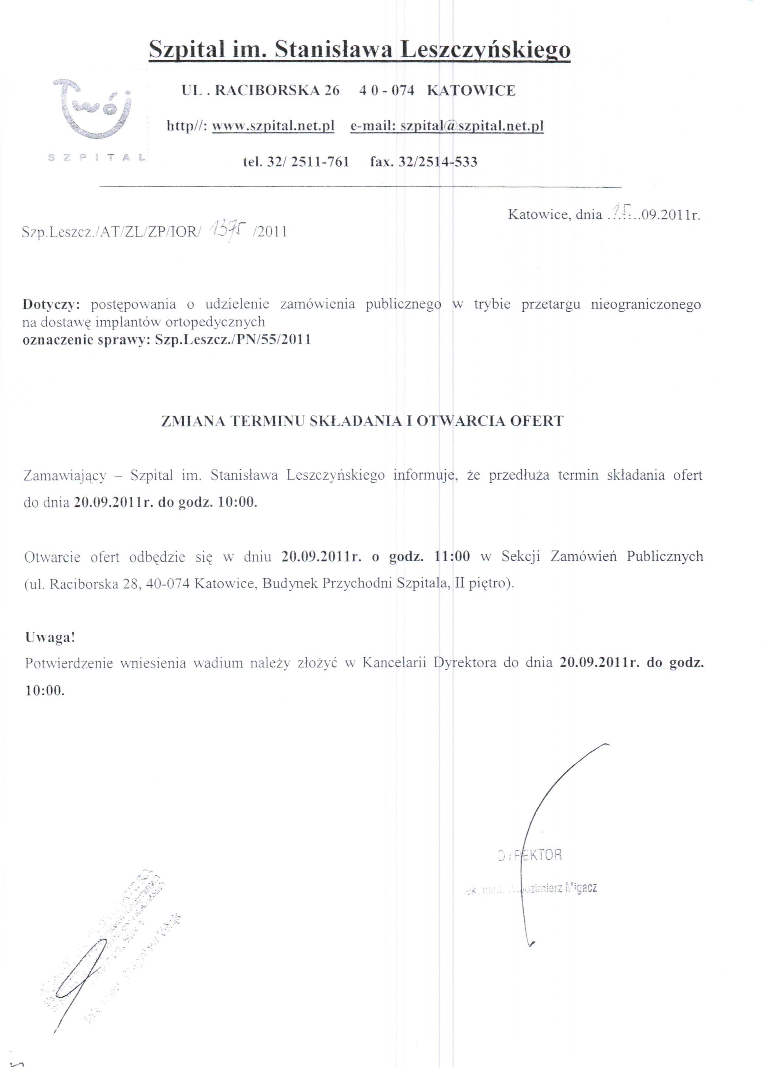w dniu 16.09.2011r. o godz. 11:00 w 40-074 Katowice, ulica Raciborska 28, budynek Przychodni, II piętro, Sekcja Zamówień Publicznych.