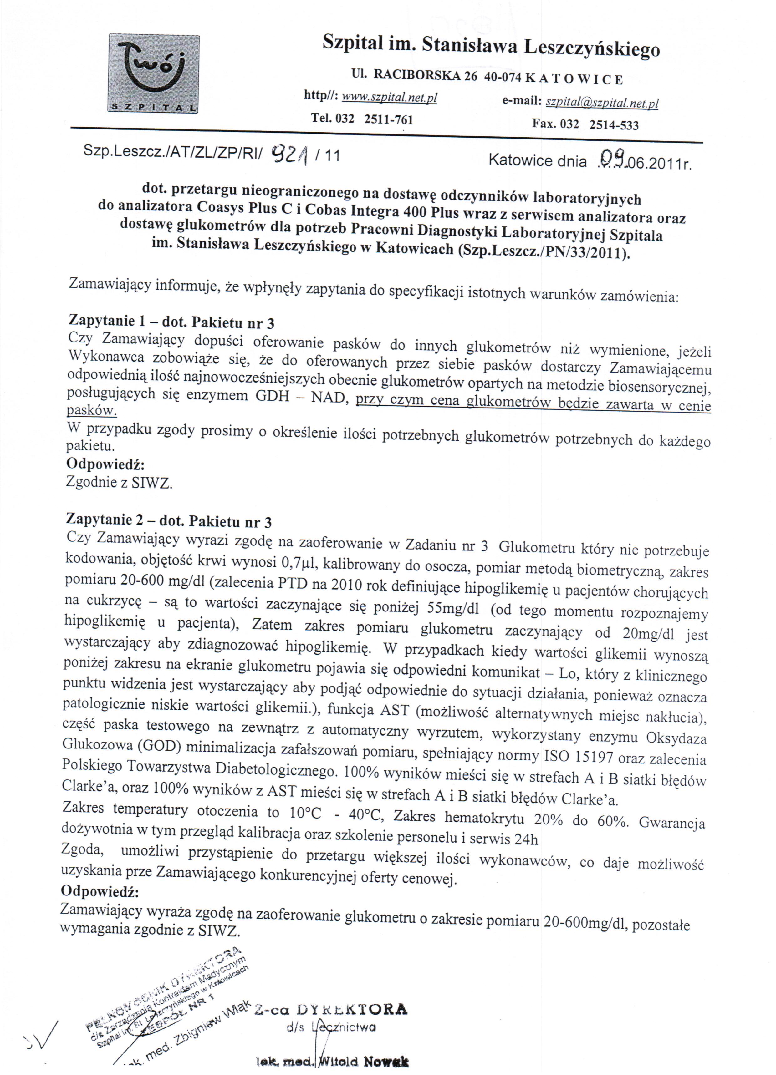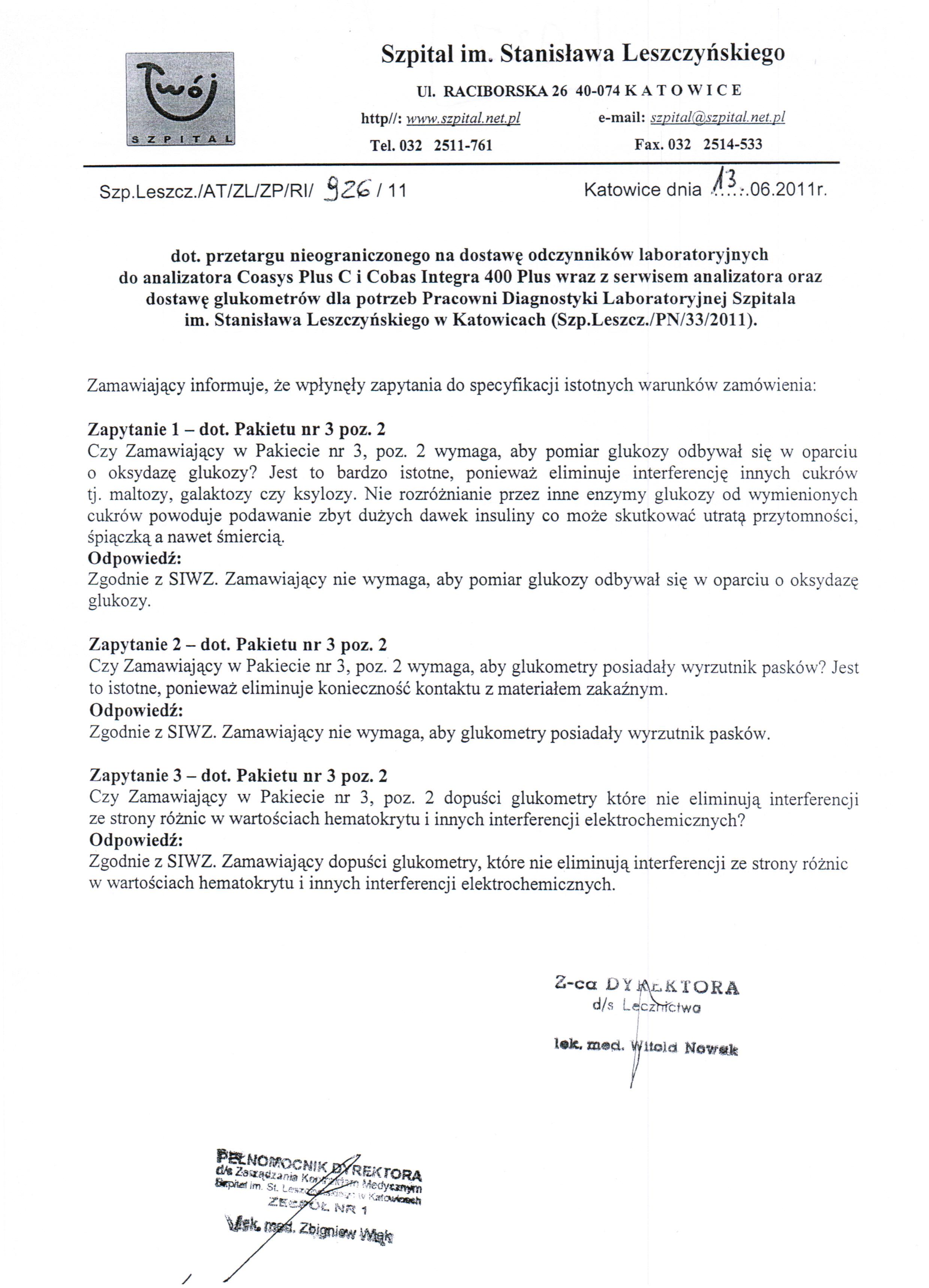 Otwarcie ofert nastąpi w dniu 16.06.2011r. o godz. 11:00 w Szpitalu im. Stanisława Leszczyńskiego w Katowicach ul. Raciborska 28, budynek Przychodni, II piętro, Sekcja Zamówień Publicznych.