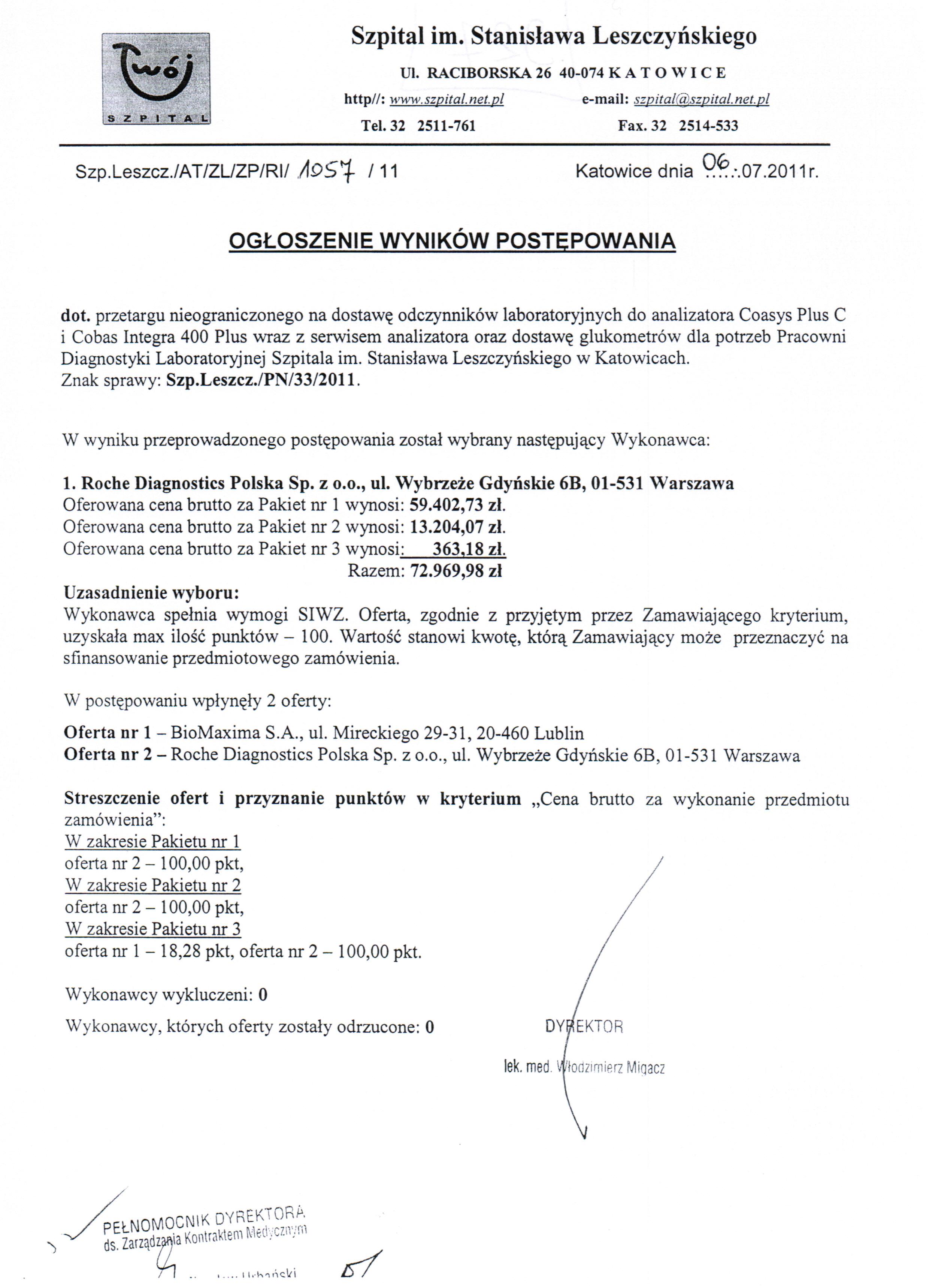 Oferty należy złożyć do dnia 16.06.2011r. do godz. 10:00 w Szpitalu im. Stanisława Leszczyńskiego w Katowicach ul. Raciborska 26 – Kancelaria Dyrektora.