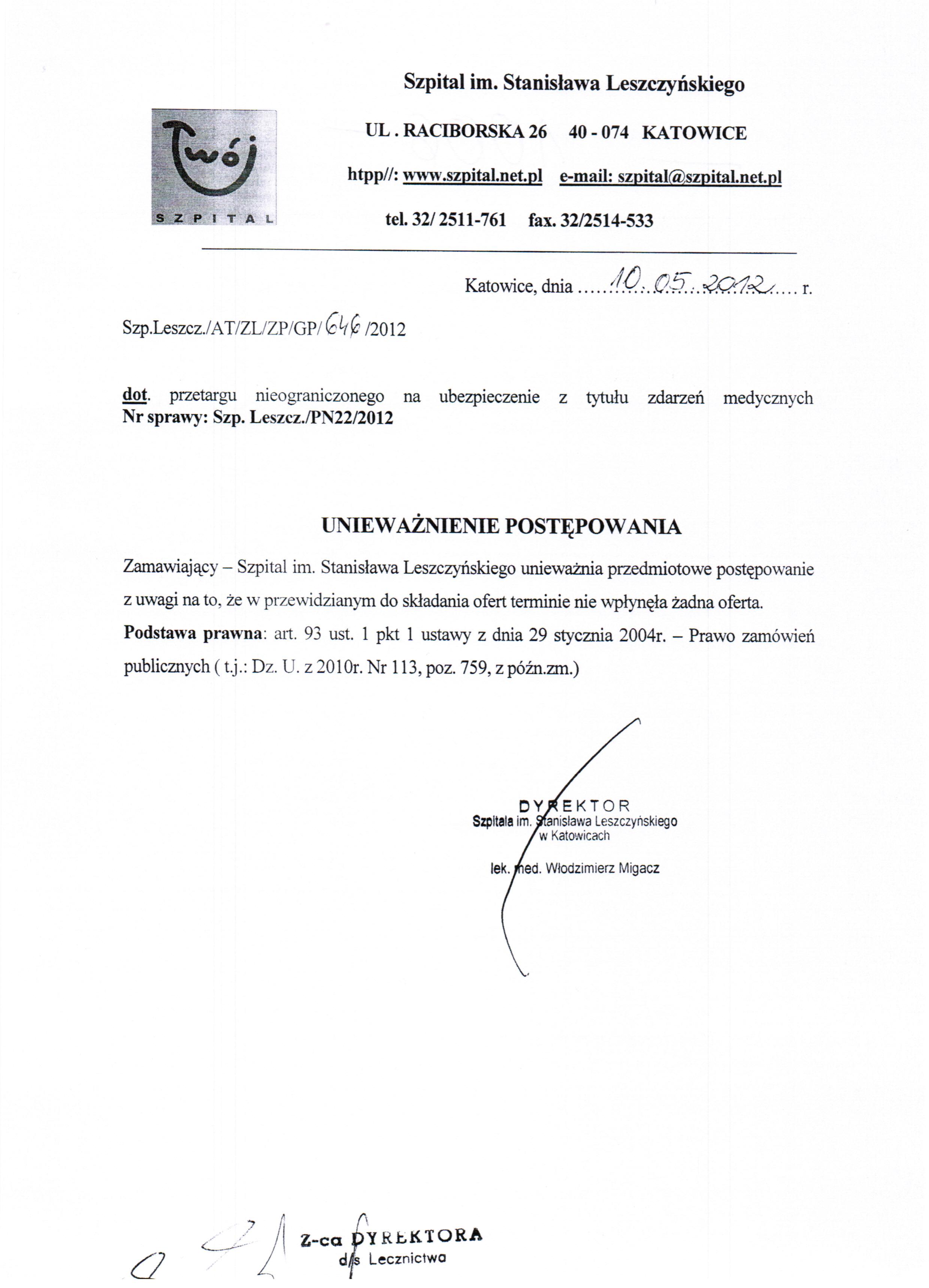 Otwarcie ofert nastąpi w dniu 07.05.2012r. o godz. 11:00 w 40– 074 Katowice, ulica Raciborska 28, budynek Przychodni, II piętro, Sekcja Zamówień Publicznych.