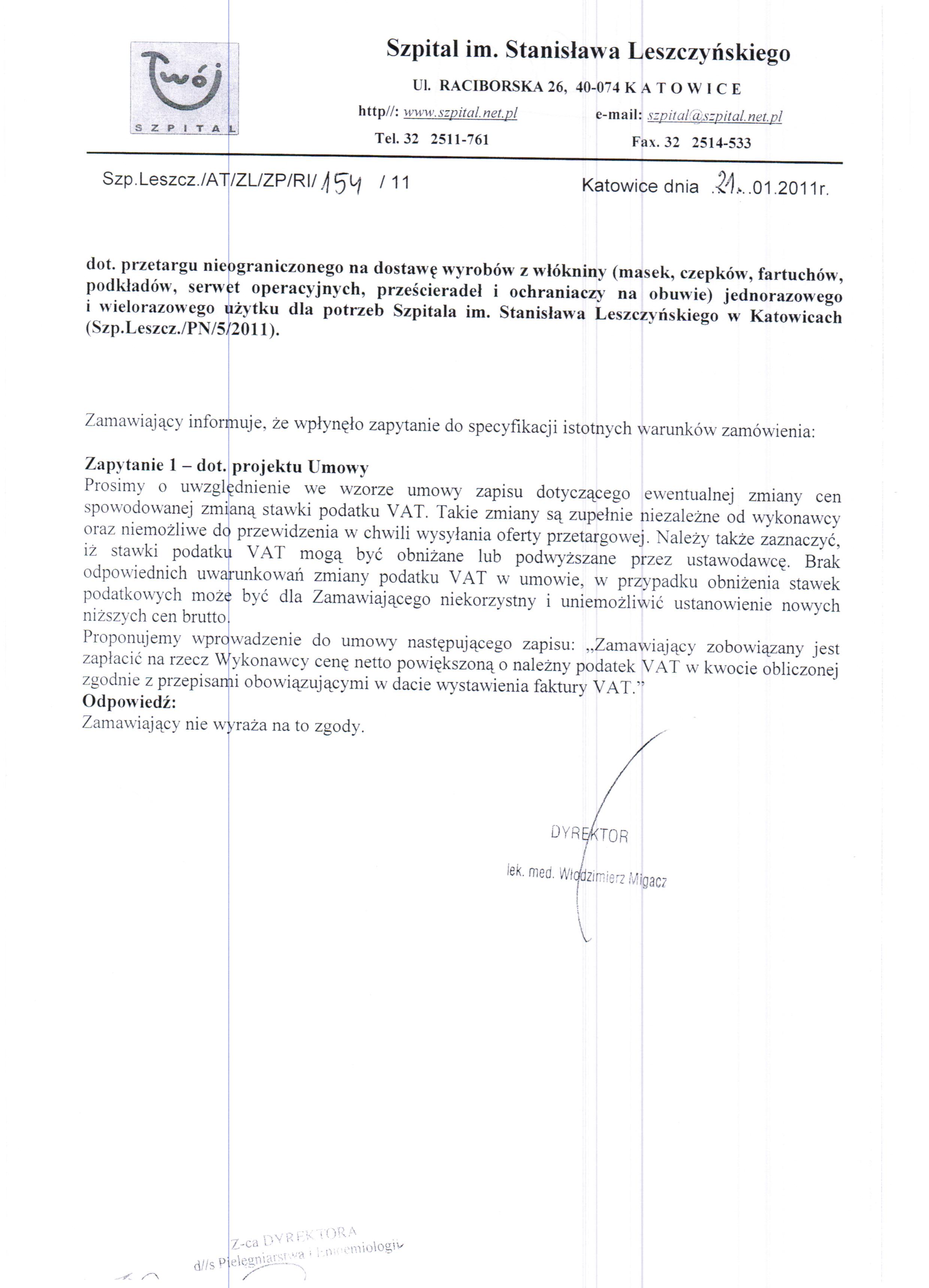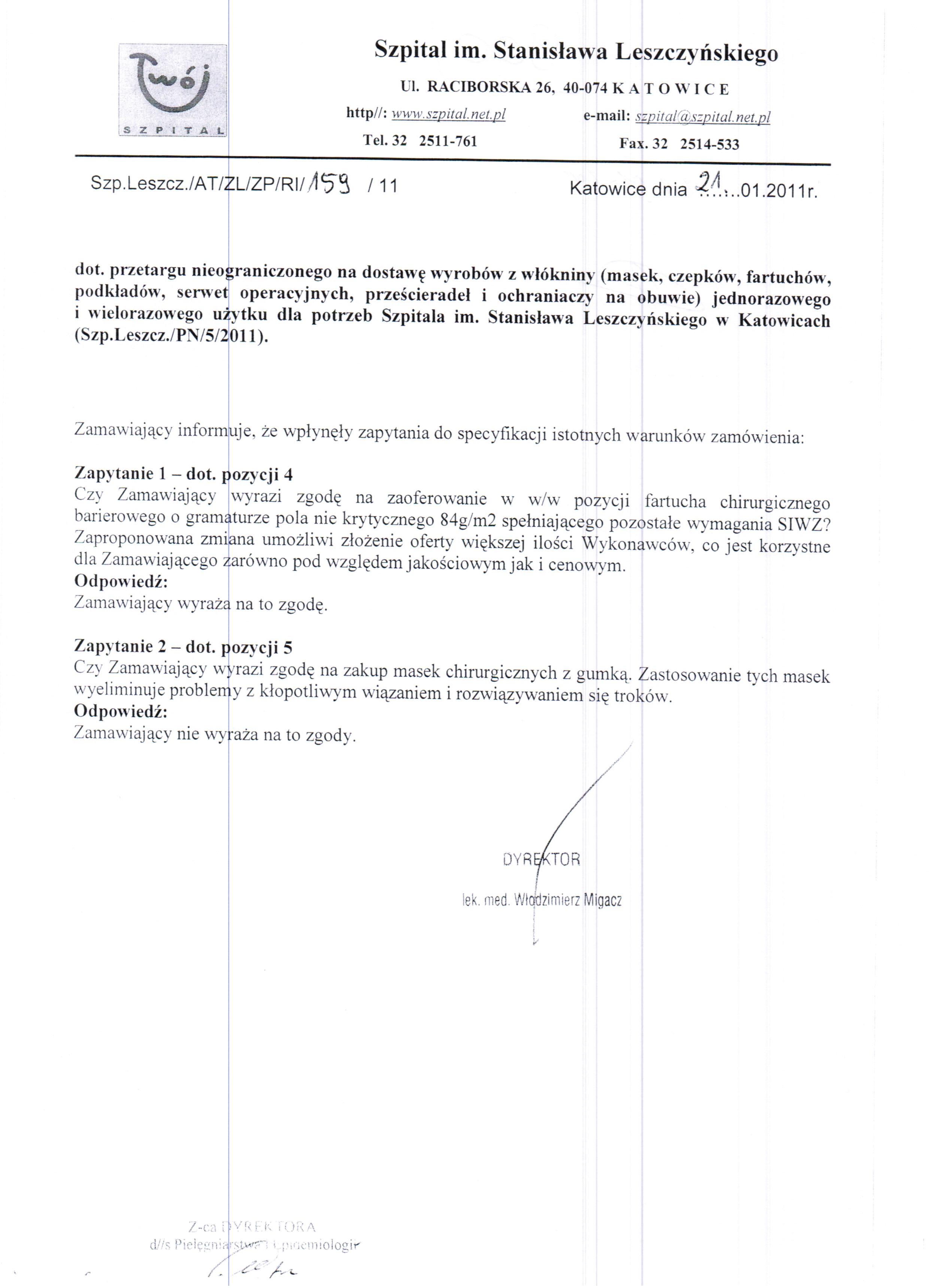 do dnia 27.01.2011r. do godz. 10:00 w Szpitalu im. Stanisława Leszczyńskiego w Katowicach ul. Raciborska 26, Kancelaria Dyrektora.