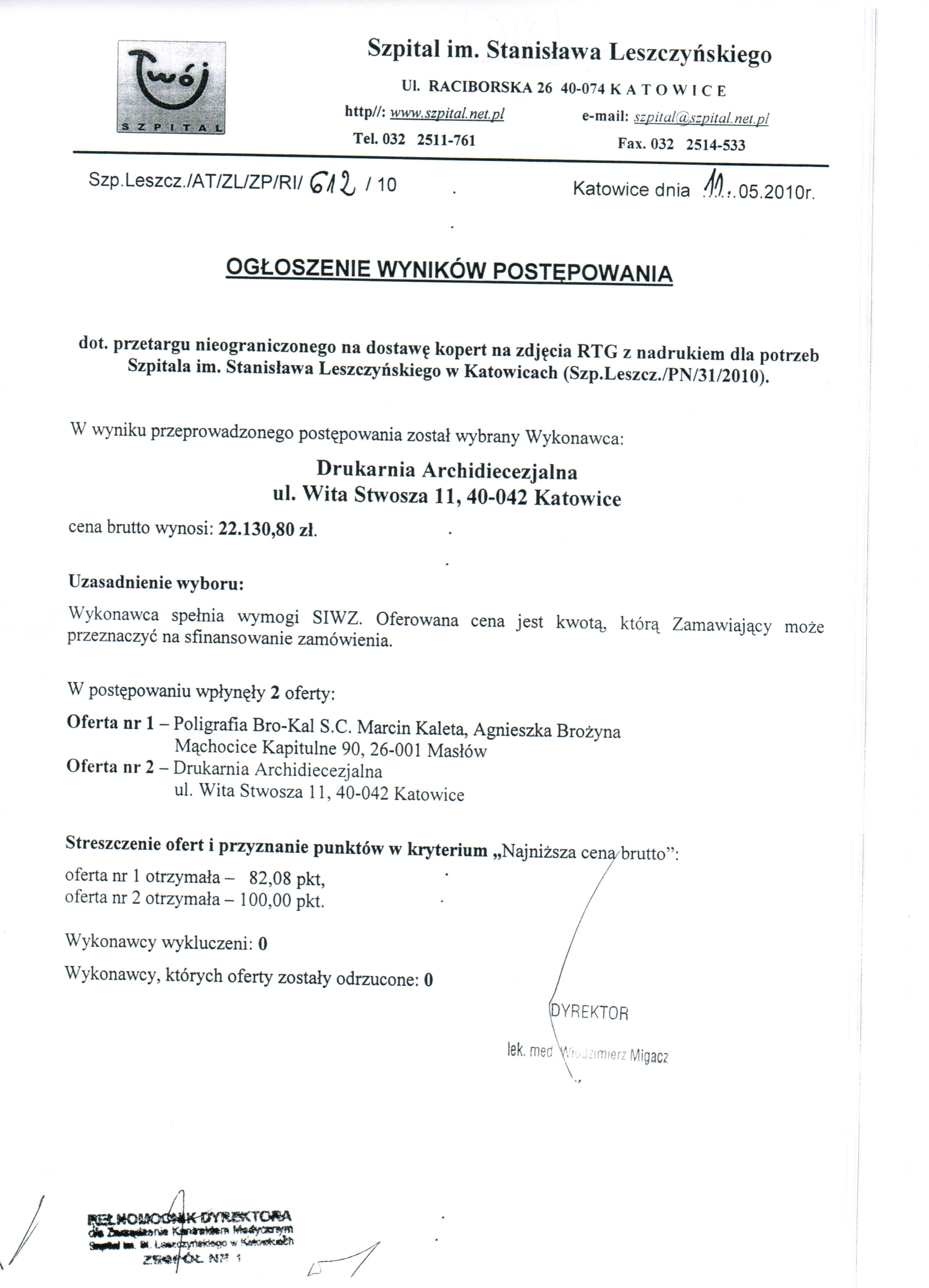 Oferty należy złożyć do dnia 05.05.2010r. do godz. 10:00 w Kancelarii Dyrektora Szpitala