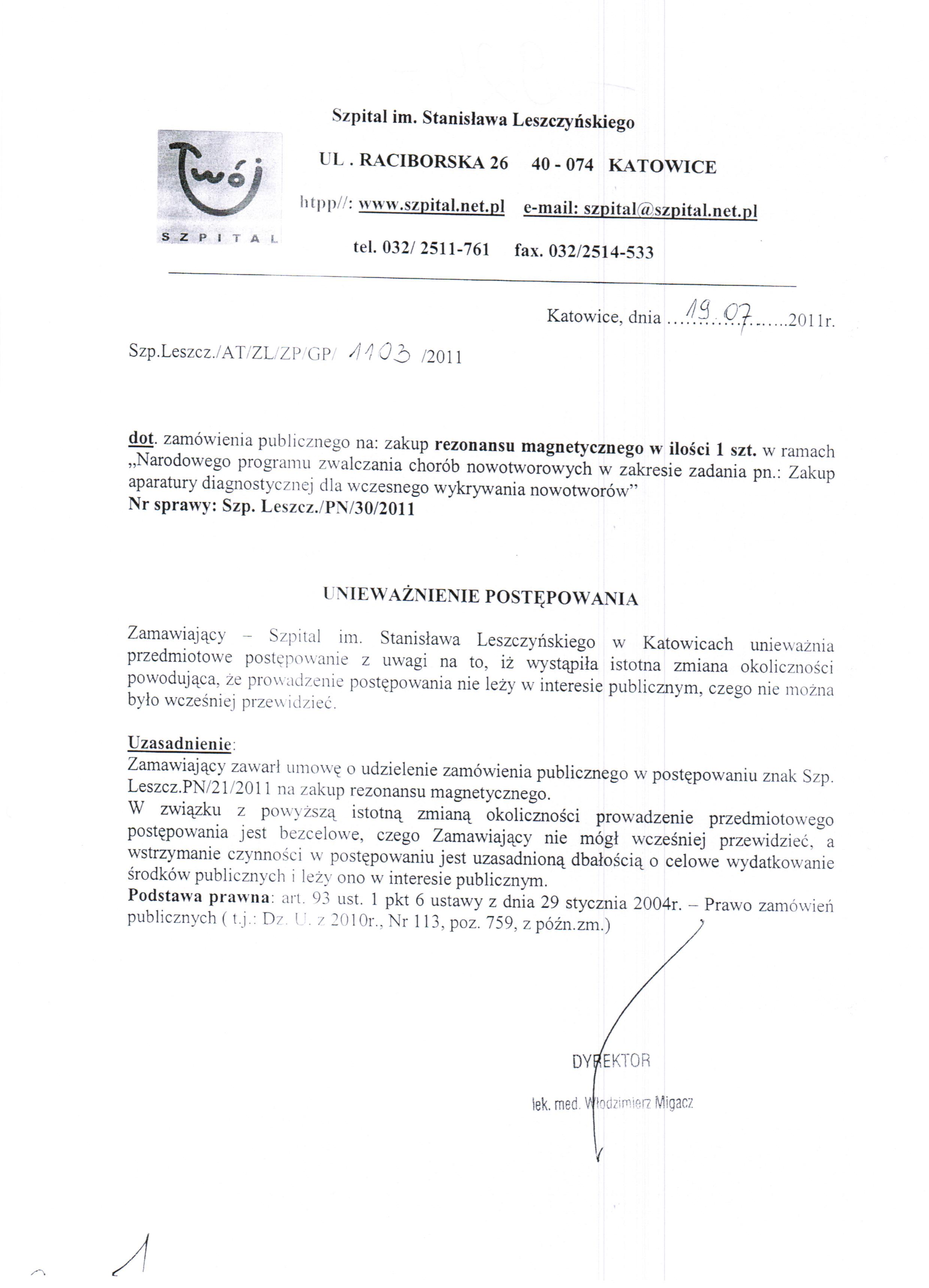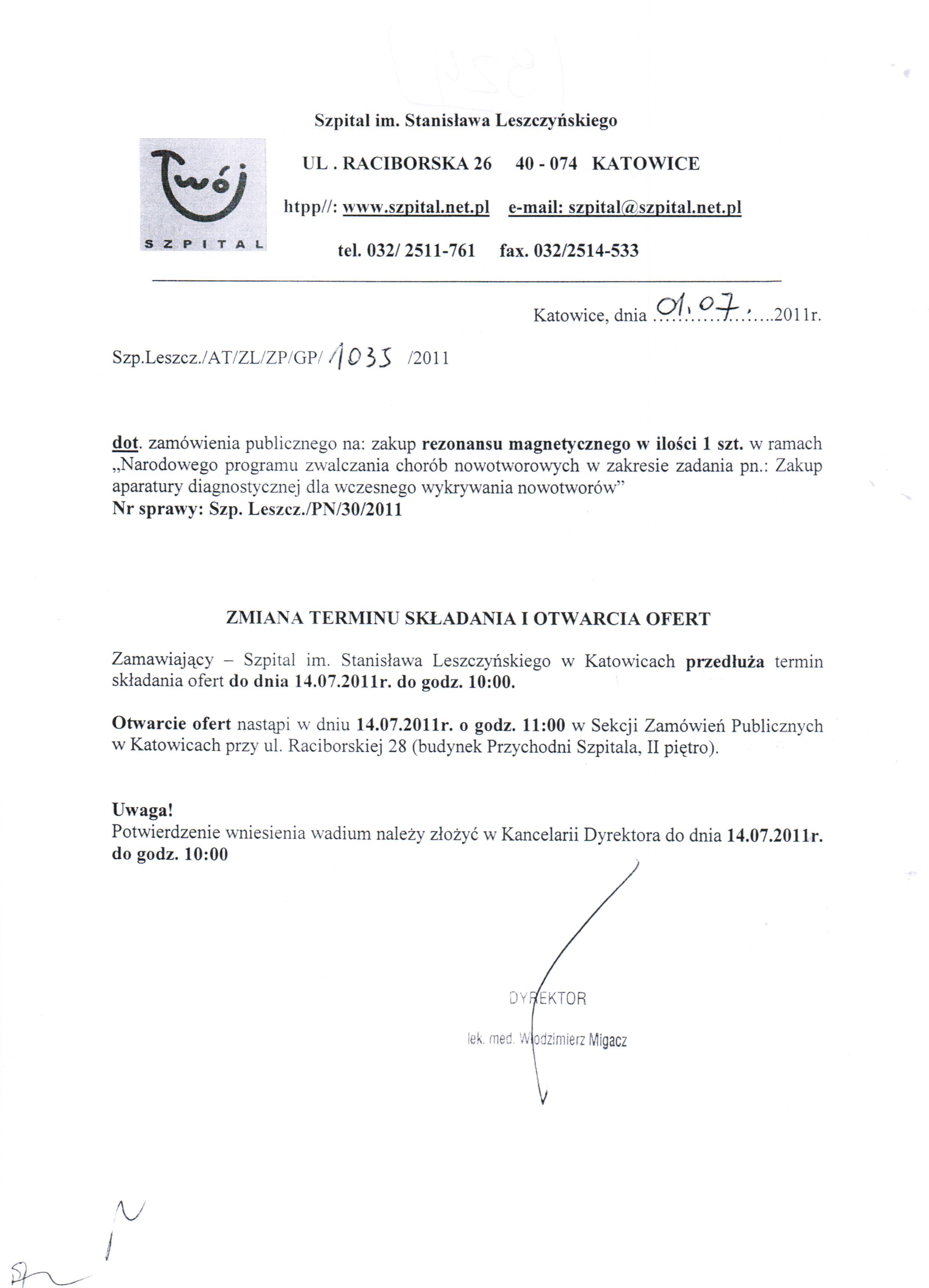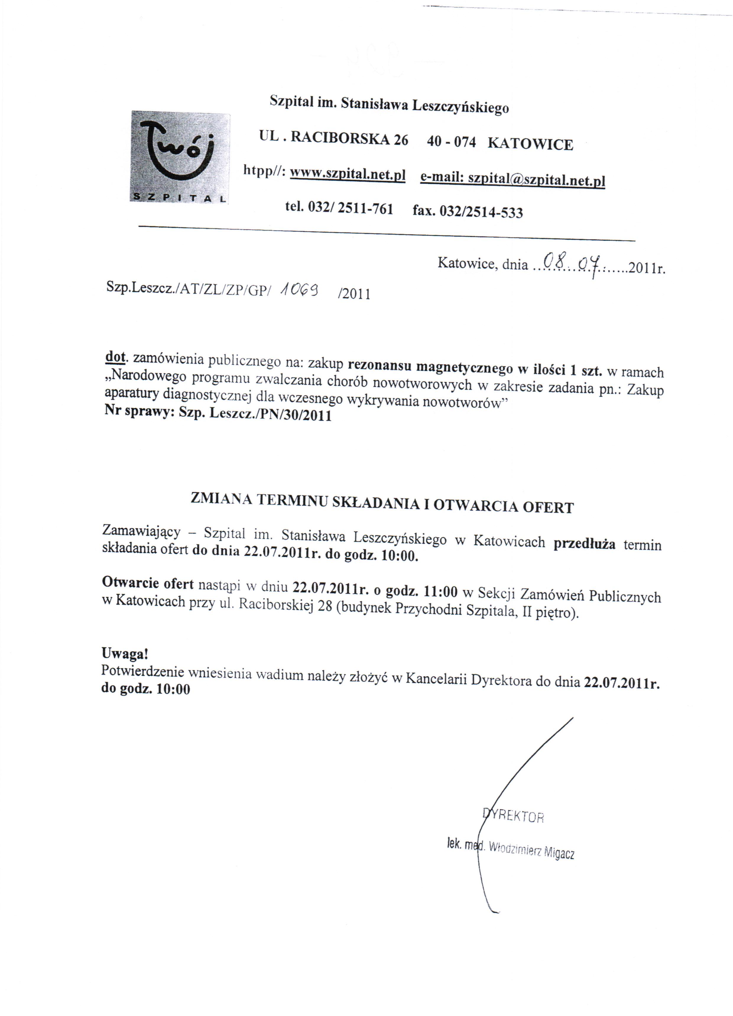 do dnia 04.07.2011r. do godz. 10:00 w Kancelarii Dyrektora Szpitala w Katowicach przy ul. Raciborskiej 26 (I piętro).
