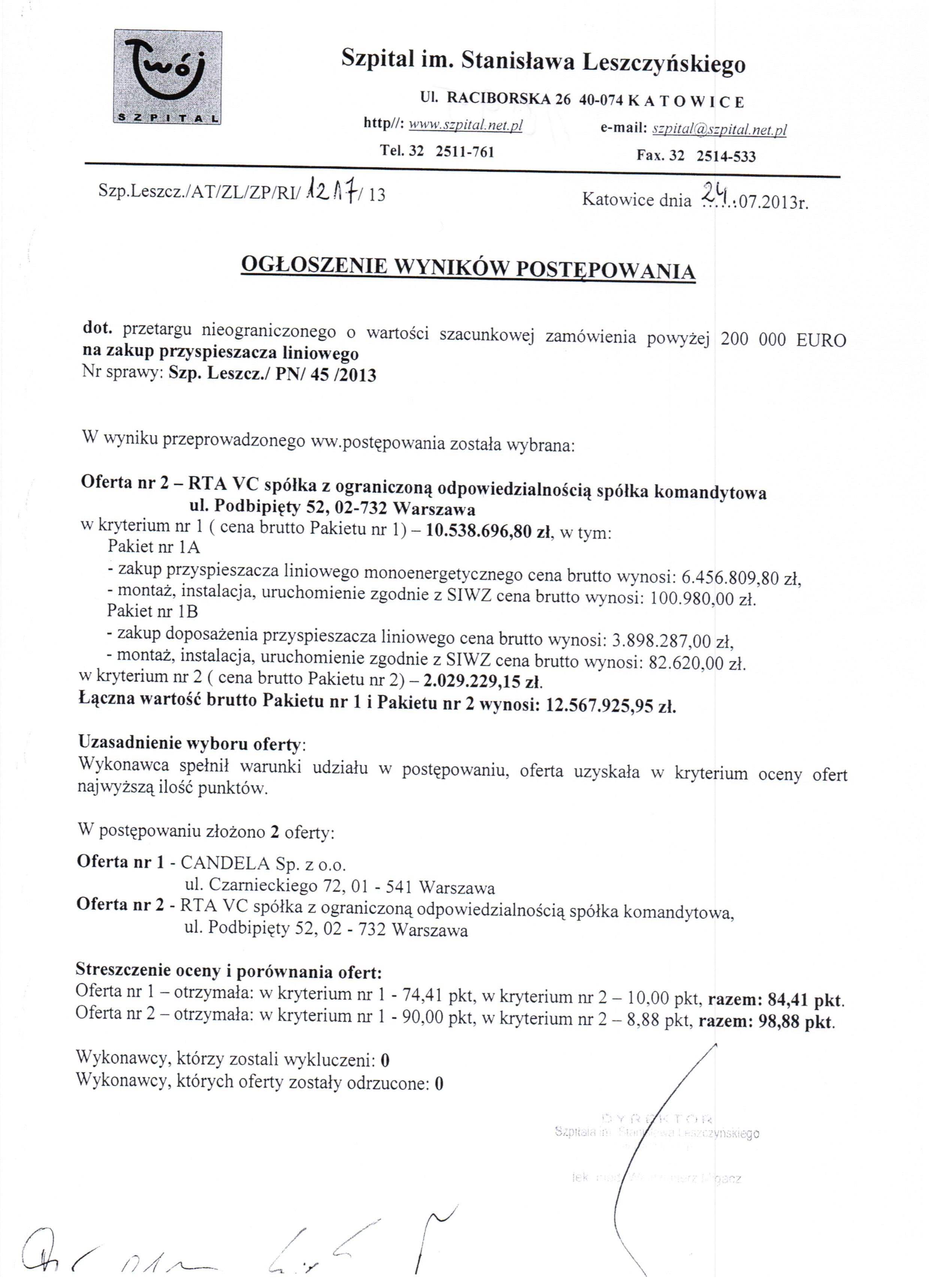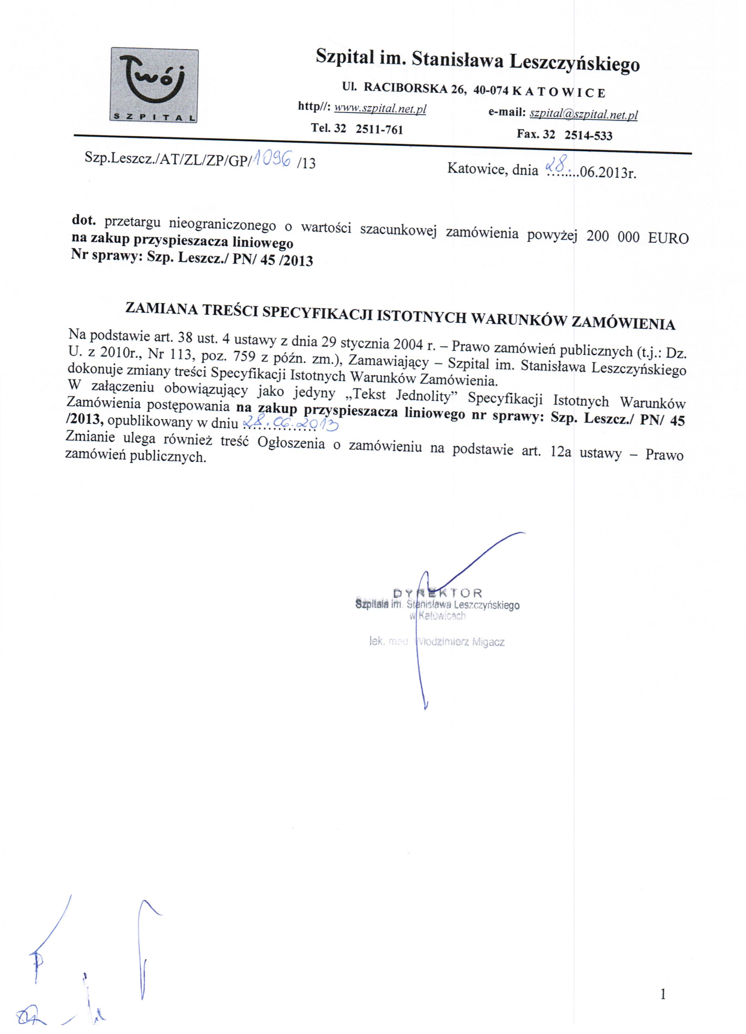 w dniu 24.06.2013r. o godz. 11:00 w Sekcji Zamówień Publicznych w Katowicach przy ul. Raciborskiej 28 (budynek Przychodni Szpitala, II piętro).