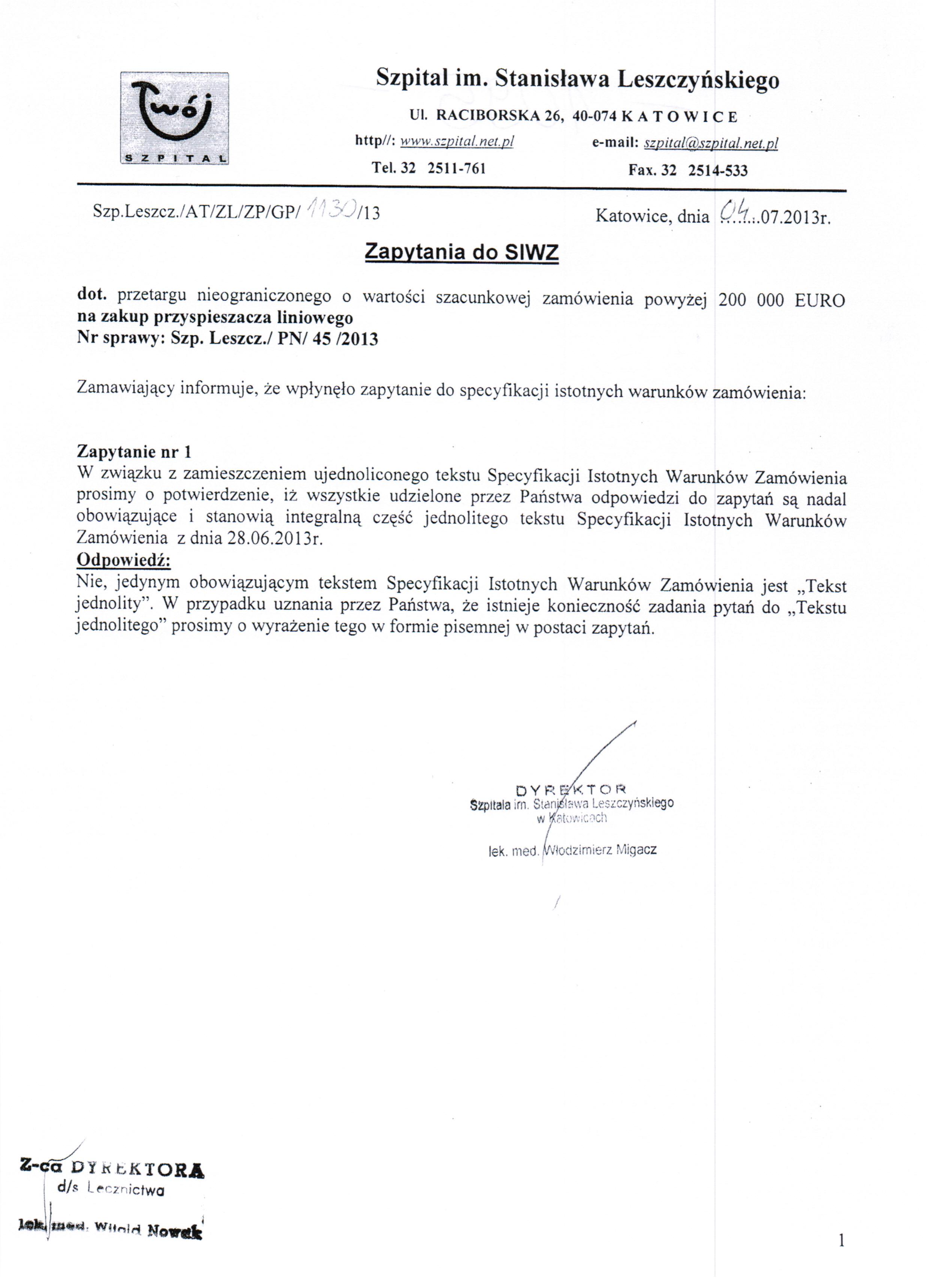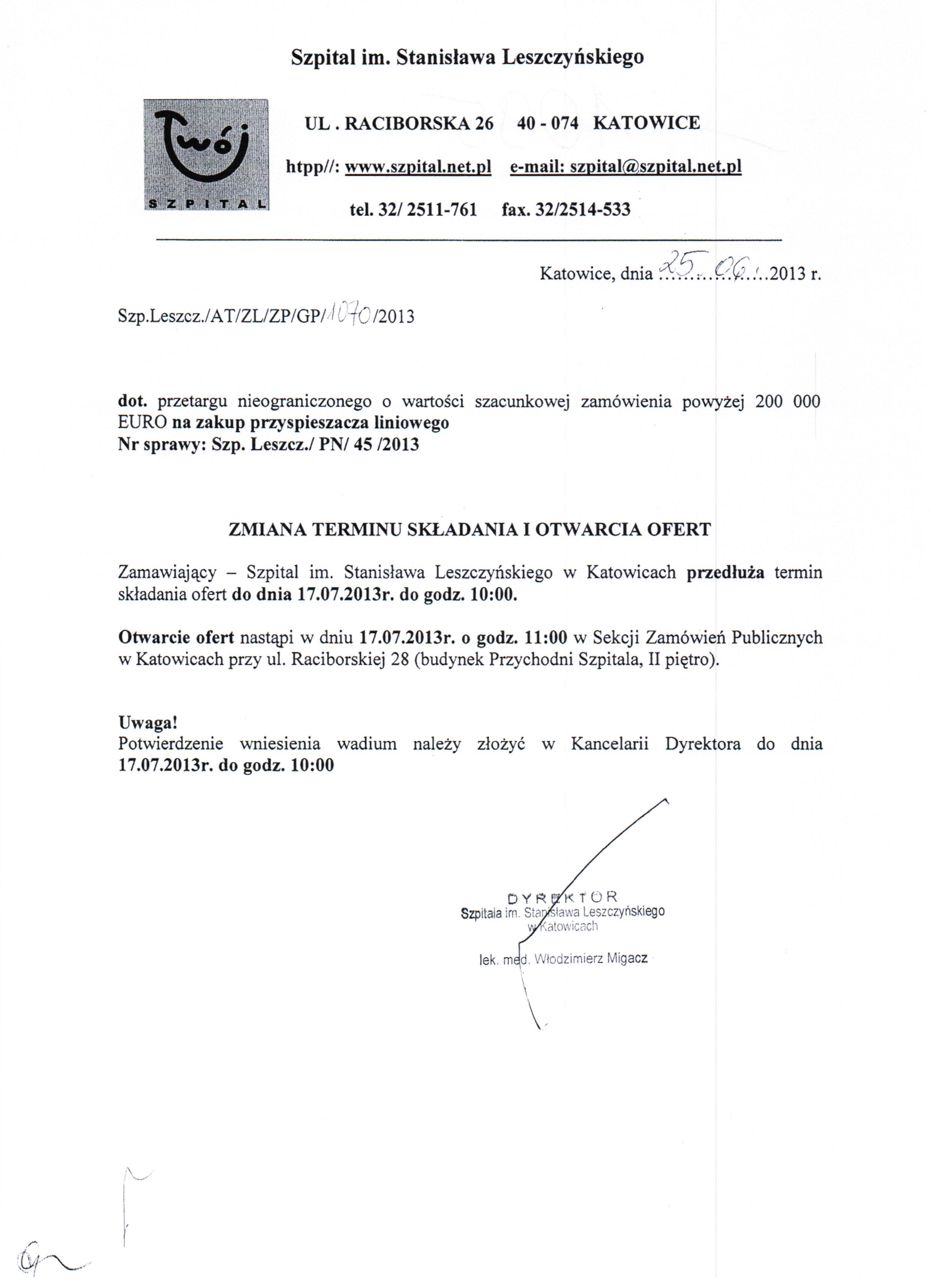 do dnia 24.06.2013r. do godz. 10:00 w Kancelarii Dyrektora Szpitala w Katowicach przy ul. Raciborskiej 26 (I piętro).