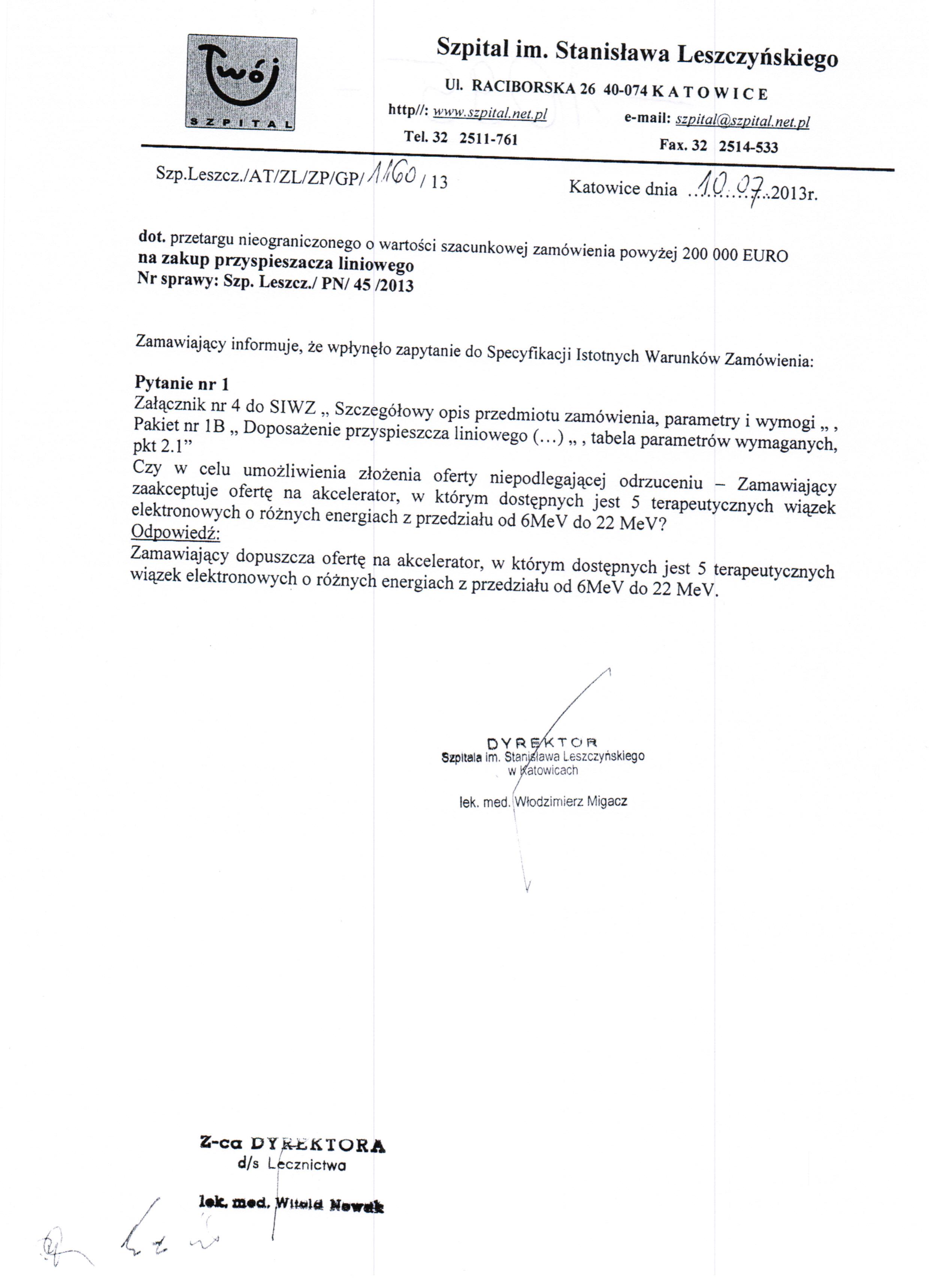 - Dot. Pakietu nr 1A. Wykonawca ponosi odpowiedzialność za utratę źródła finansowania zakupu przyspieszacza liniowego finansowanego przez Ministra Zdrowia w przypadku nie posadowienia sprzętu w obiekcie w terminie zgodnym z Umową.