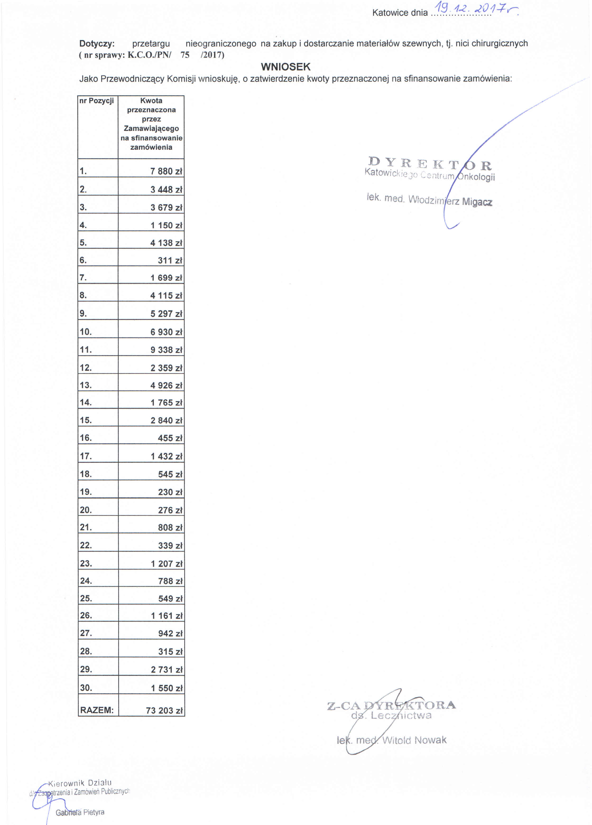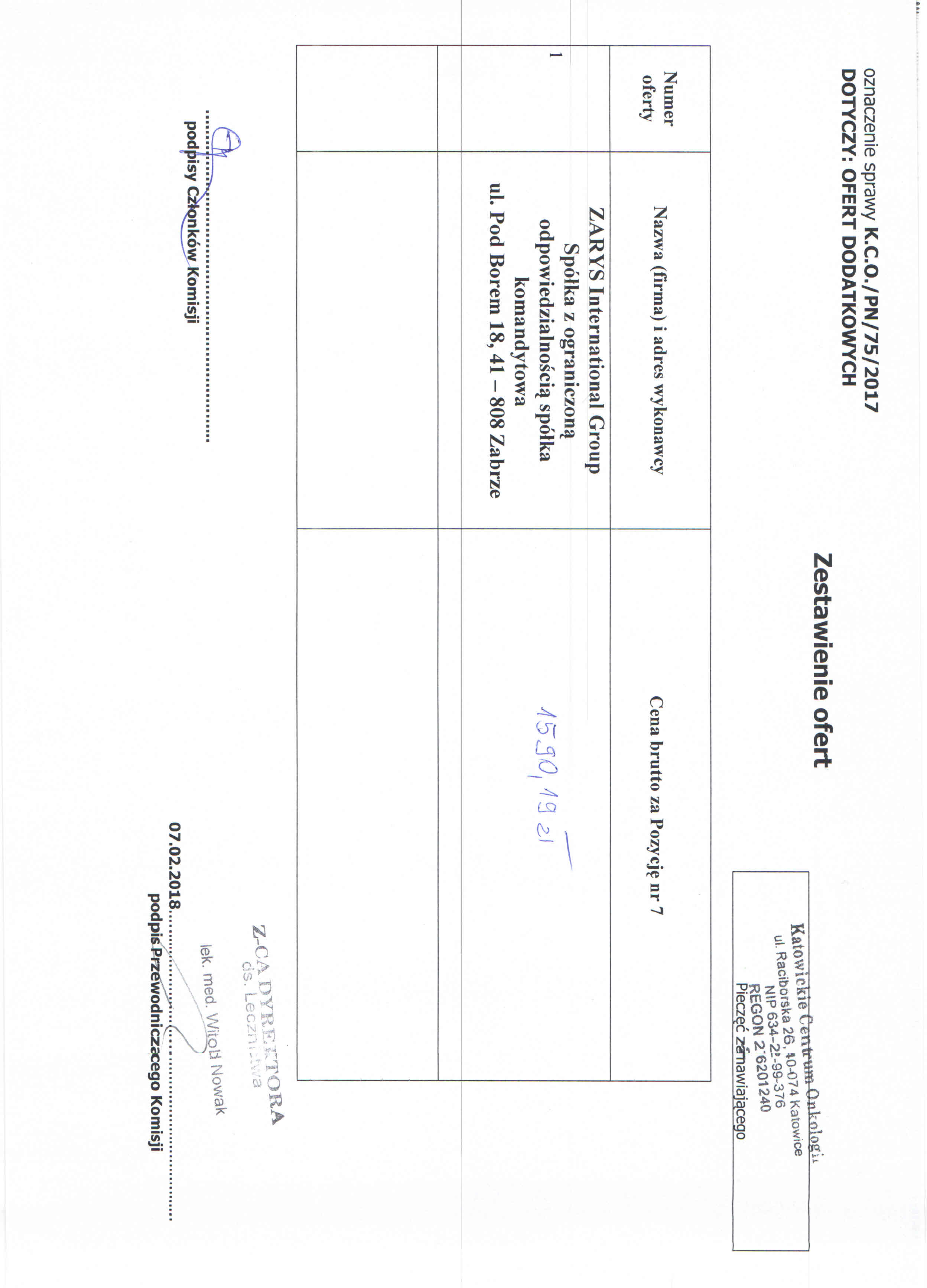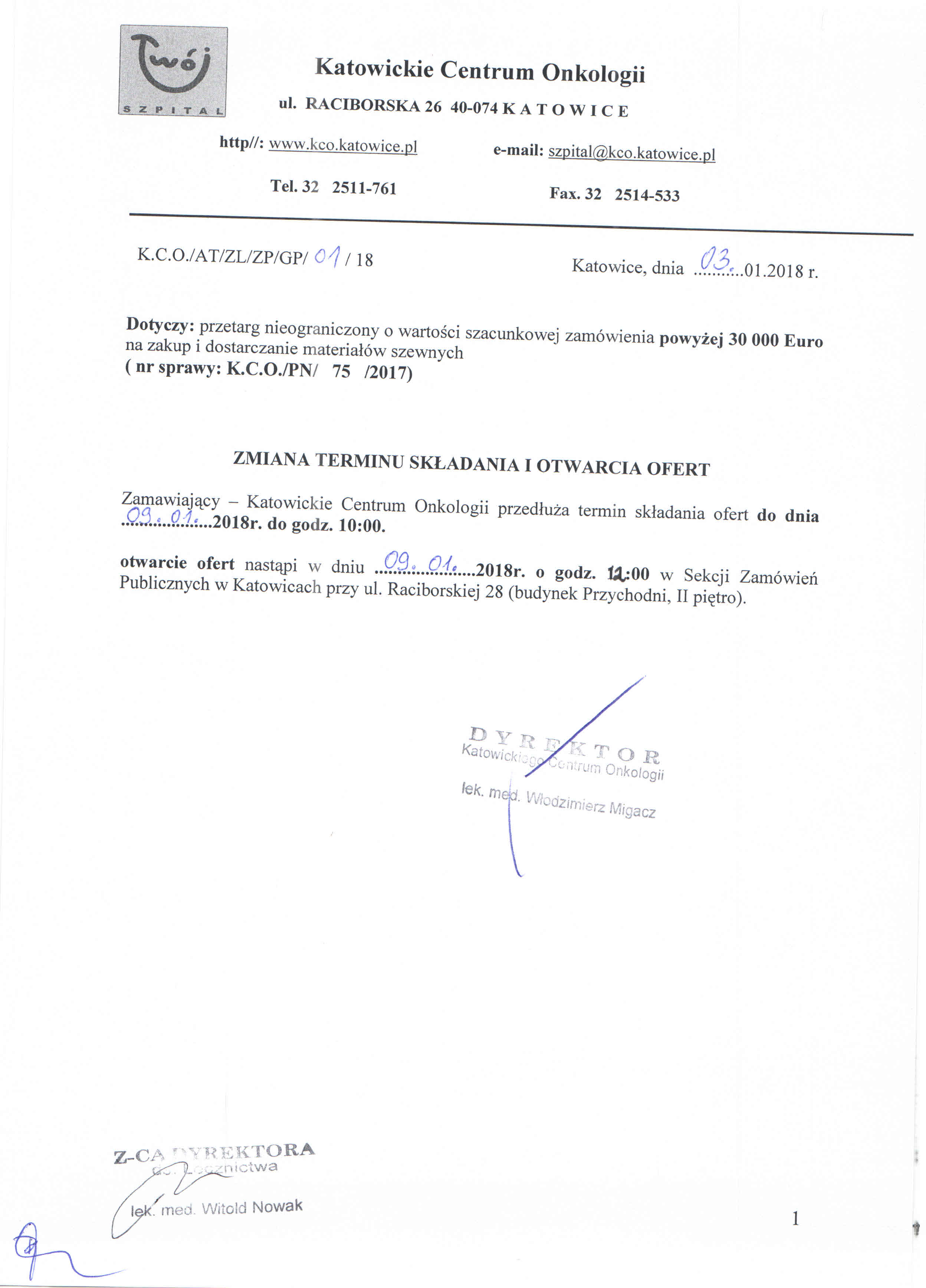 w dniu 05.01.2018r. o godz. 11:00 w Katowickim Centrum Onkologii ul. Raciborska 28, budynek Przychodni, II piętro, Sekcja Zamówień Publicznych.