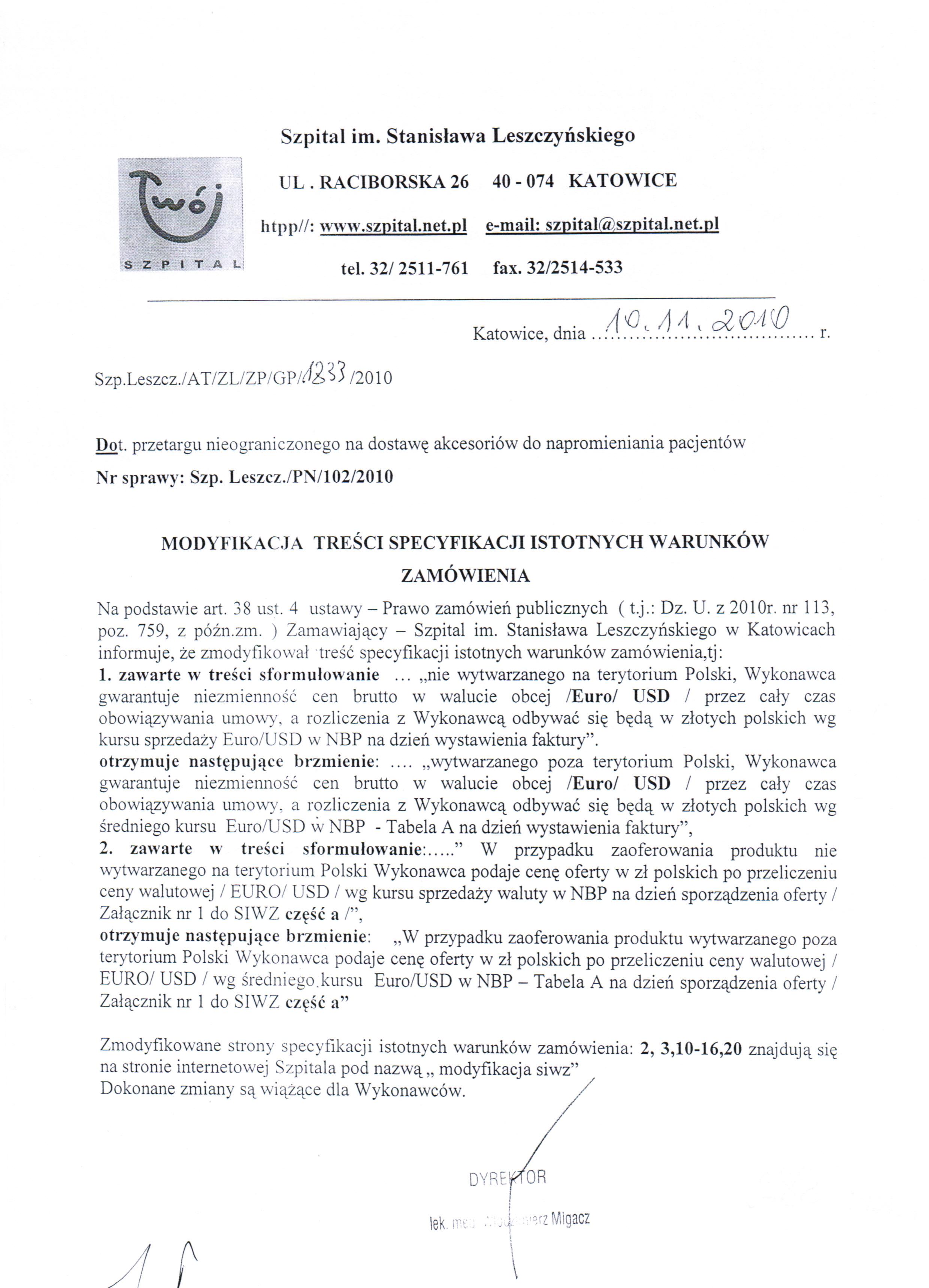 Oferty należy złożyć do dnia 15.11.2010r. do godz. 10:00 w Sekretariacie Dyrektora Szpitala w Katowicach przy ul. Raciborskiej 27 (budynek Zakładu Radioterapii, I piętro).