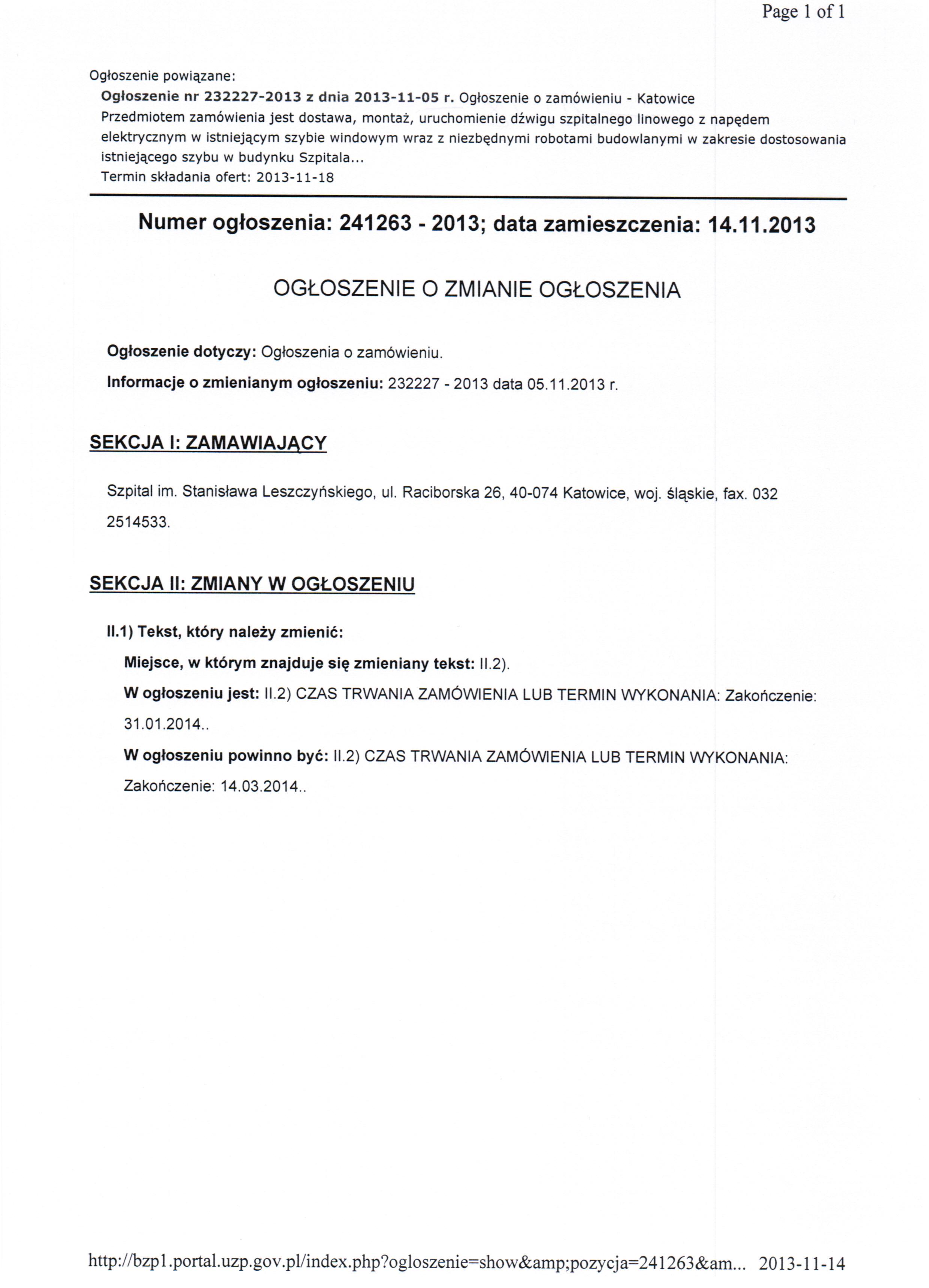 w dniu 18.11.2013 r. o godz. 11:00 w Szpitalu im. Stanisława Leszczyńskiego w Katowicach ul. Raciborska 28, budynek Przychodni, II piętro, Sekcja Zamówień Publicznych.