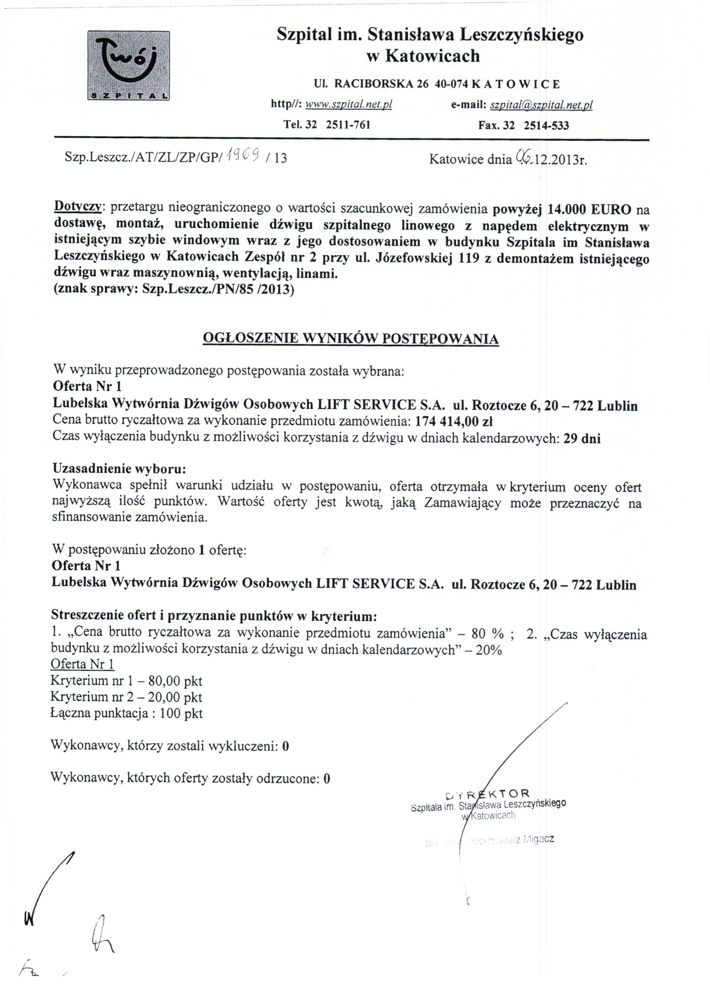 do dnia 18.11.2013 r. do godz. 10:00 w Szpitalu im. Stanisława Leszczyńskiego w Katowicach ul. Raciborska 26 – Kancelaria Dyrektora.