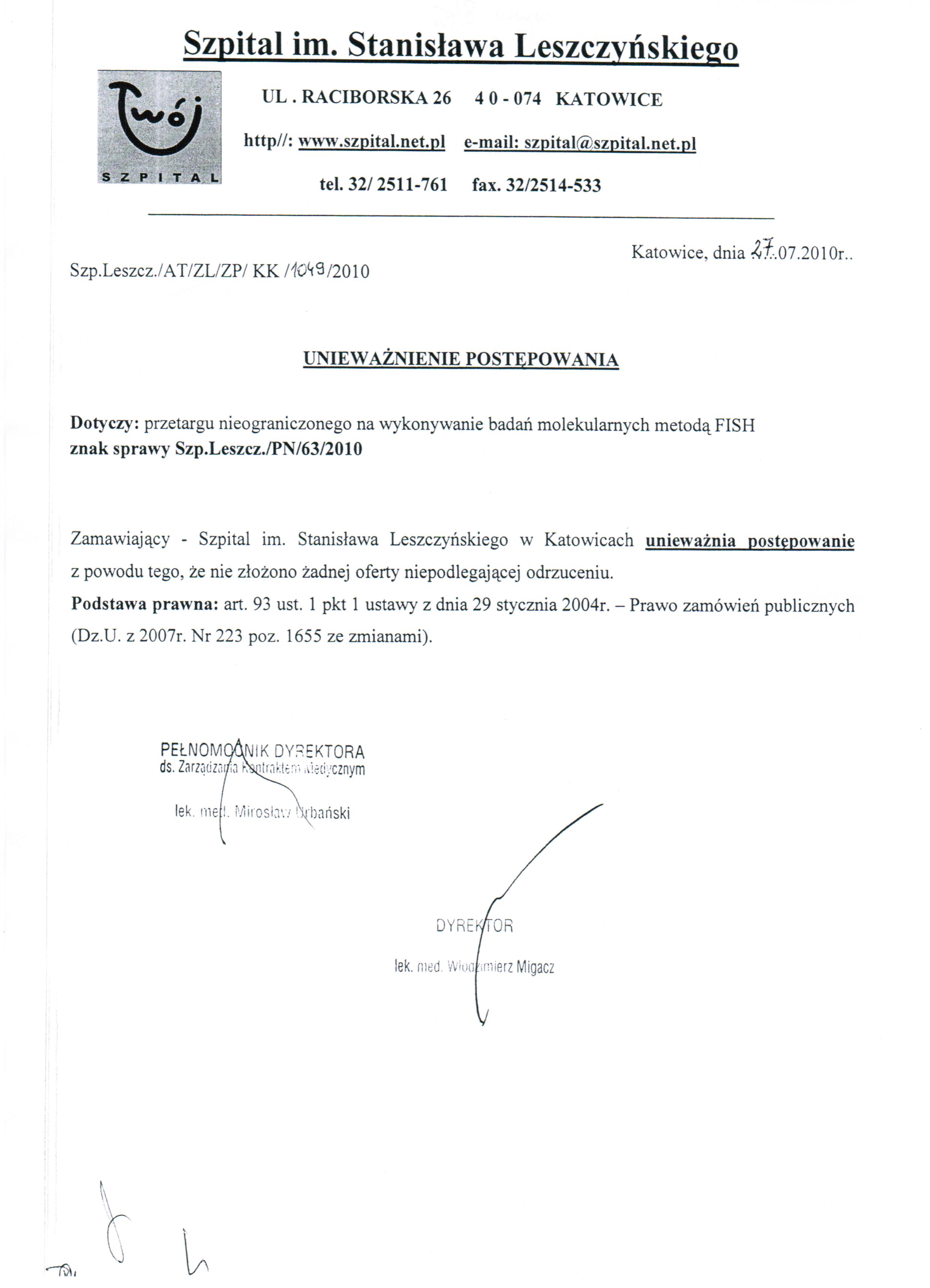 Oferty należy złożyć do dnia 23.07.2010 r. do godz. 10:00 w Kancelarii Dyrektora Szpitala w Katowicach przy ul. Raciborskiej 26.
