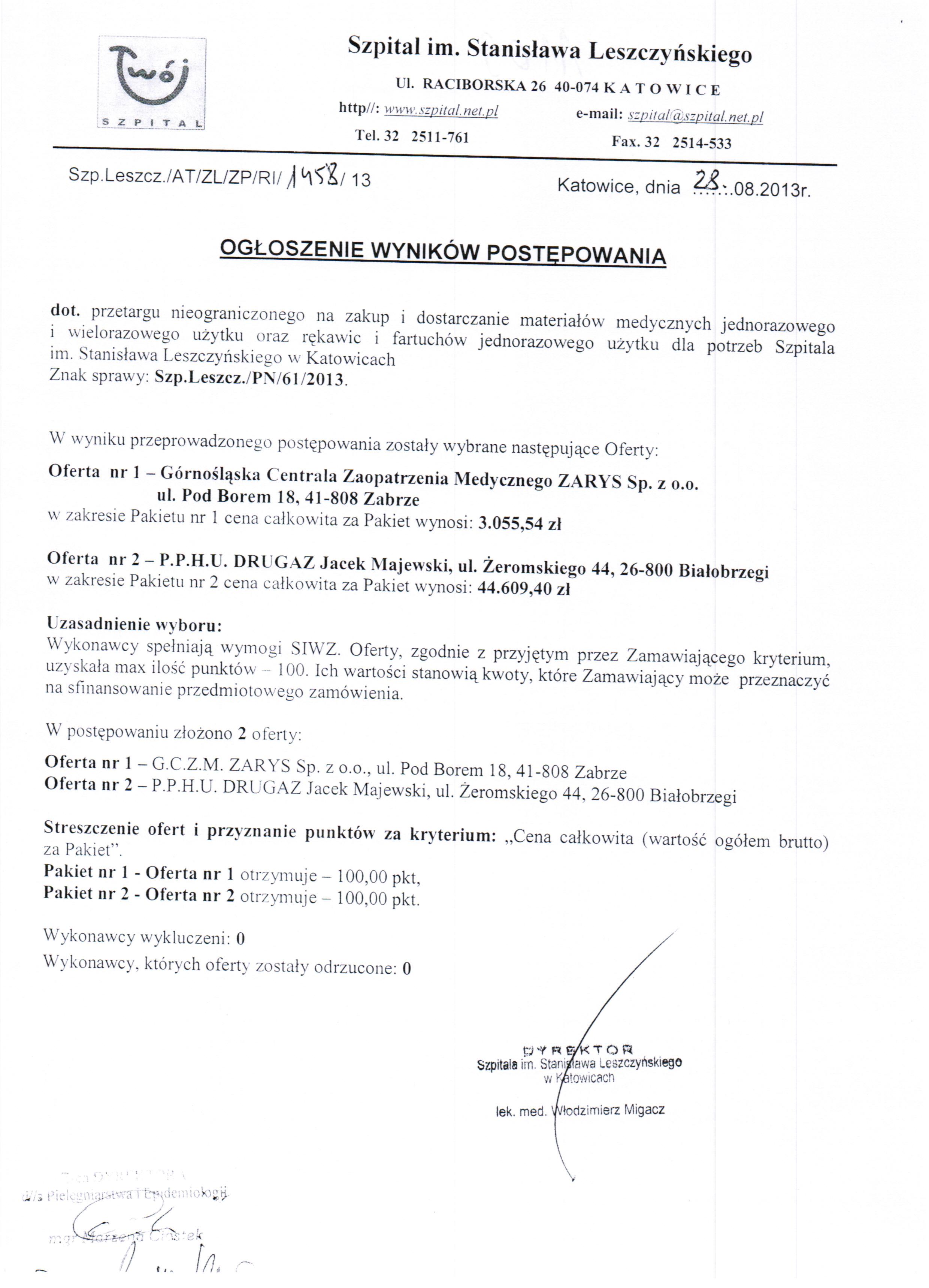 do dnia 14.08.2013 r. do godz. 10:00 w Szpitalu im. Stanisława Leszczyńskiego w Katowicach ul. Raciborska 26 – Kancelaria Dyrektora.
