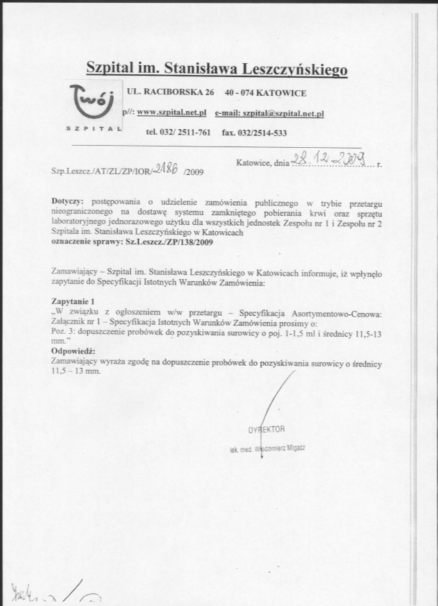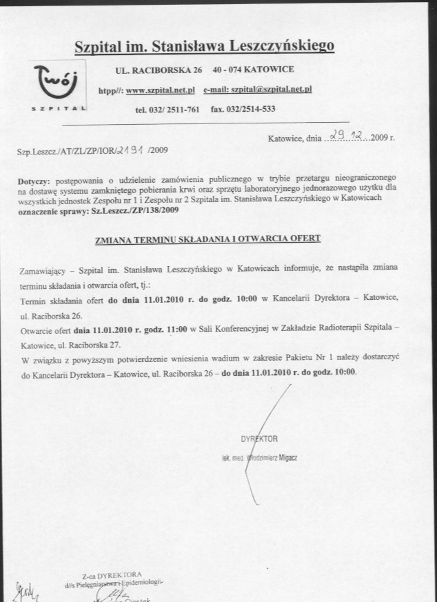 Oferty należy złożyć do 06.01.2010r. do godz. 10:00 w Kancelarii Dyrektora Szpitala w Katowicach przy ul. Raciborskiej 26.