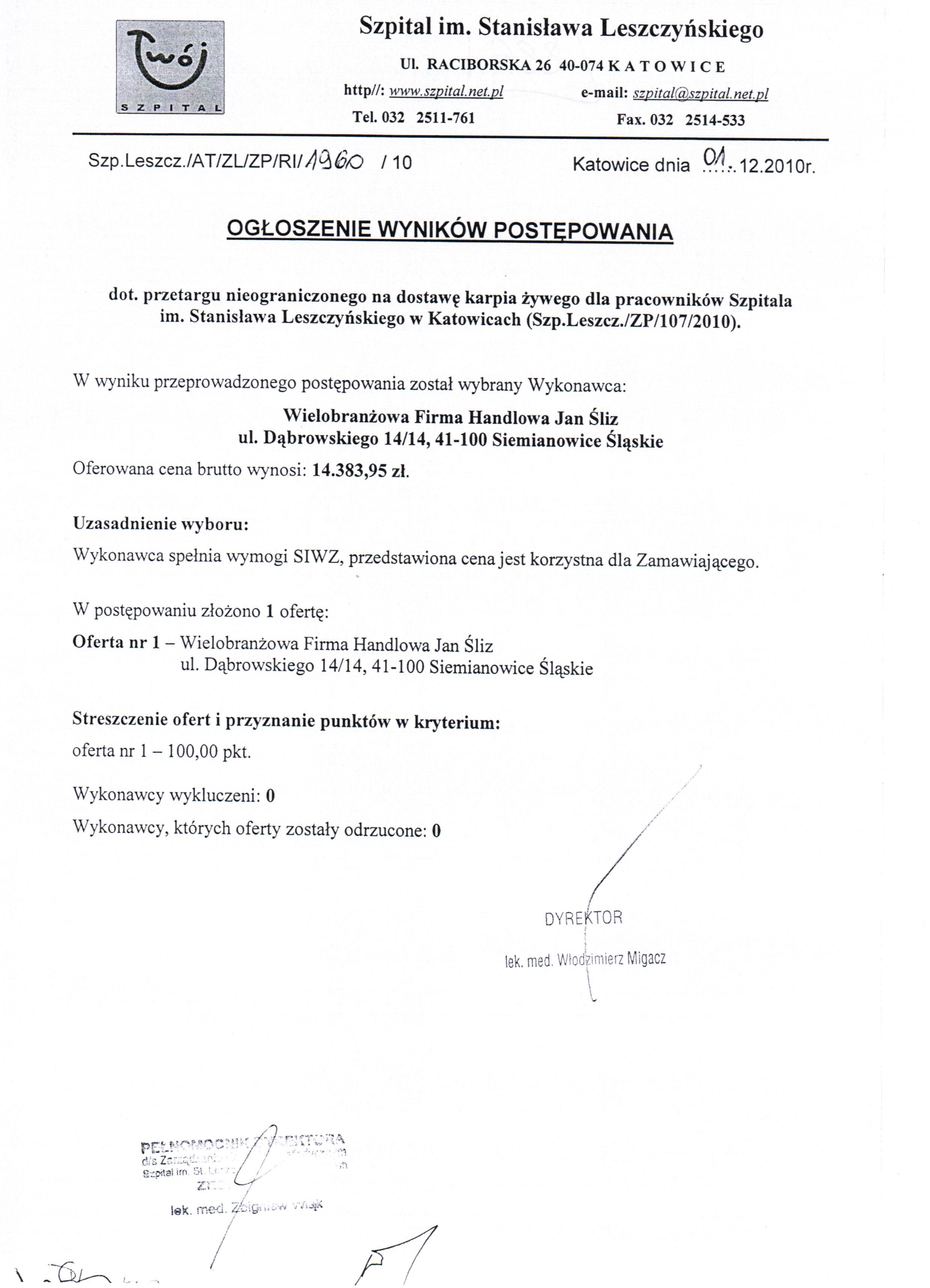 Otwarcie ofert nastąpi w dniu 26.11.2010r. o godz. 12:00 w Szpitalu im. Stanisława Leszczyńskiego w Katowicach ul. Raciborska 28, budynek Przychodni, II piętro, Sekcja Zamówień Publicznych.