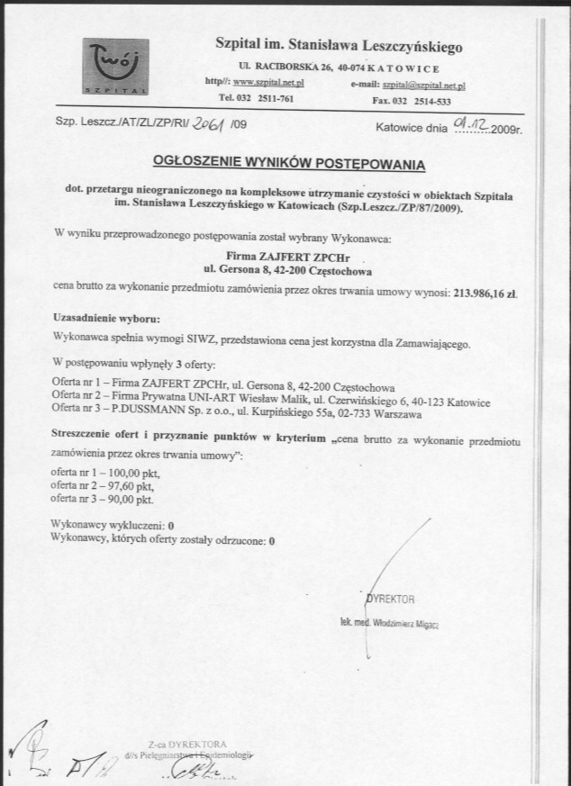 kompleksowe utrzymanie czystości i wykonanie dezynfekcji w obiektach Szpitala im. Stanisława Leszczyńskiego w Katowicach - Zakładzie Radioterapii przy ul. Raciborskiej 27 i budynku poradni przy ul. Raciborskiej 28.