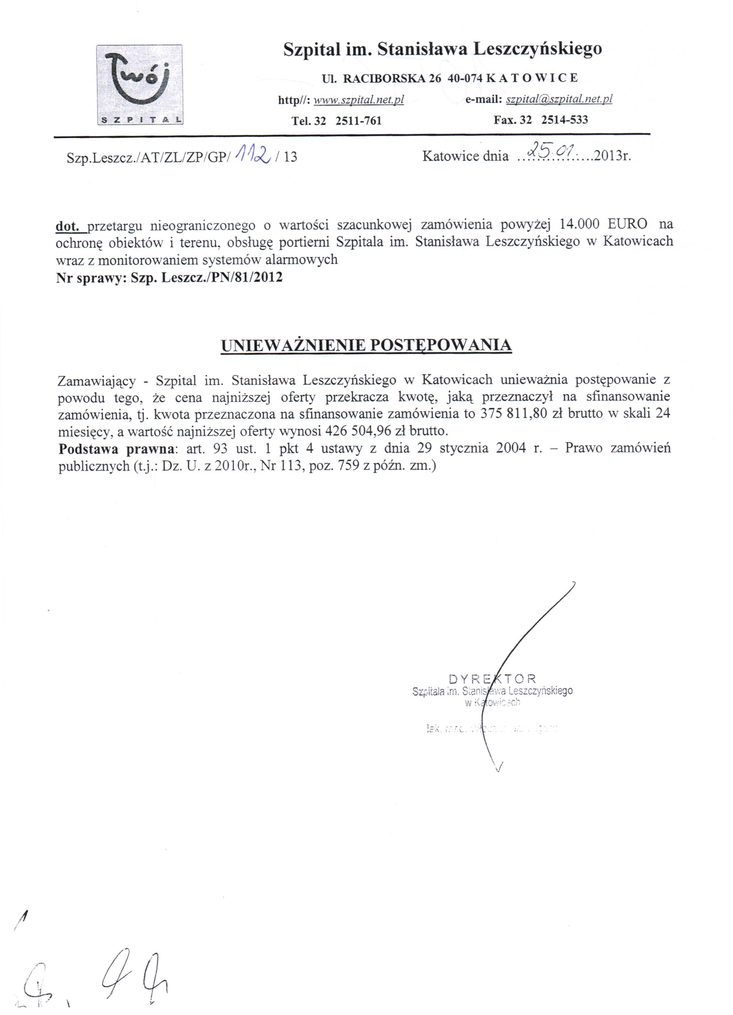 ogłasza przetarg nieograniczony o wartości szacunkowej zamówienia powyżej 14.000 EURO na ochronę obiektów i terenu, obsługę portierni Szpitala im. Stanisława Leszczyńskiego w Katowicach wraz z monitorowaniem systemów alarmowych