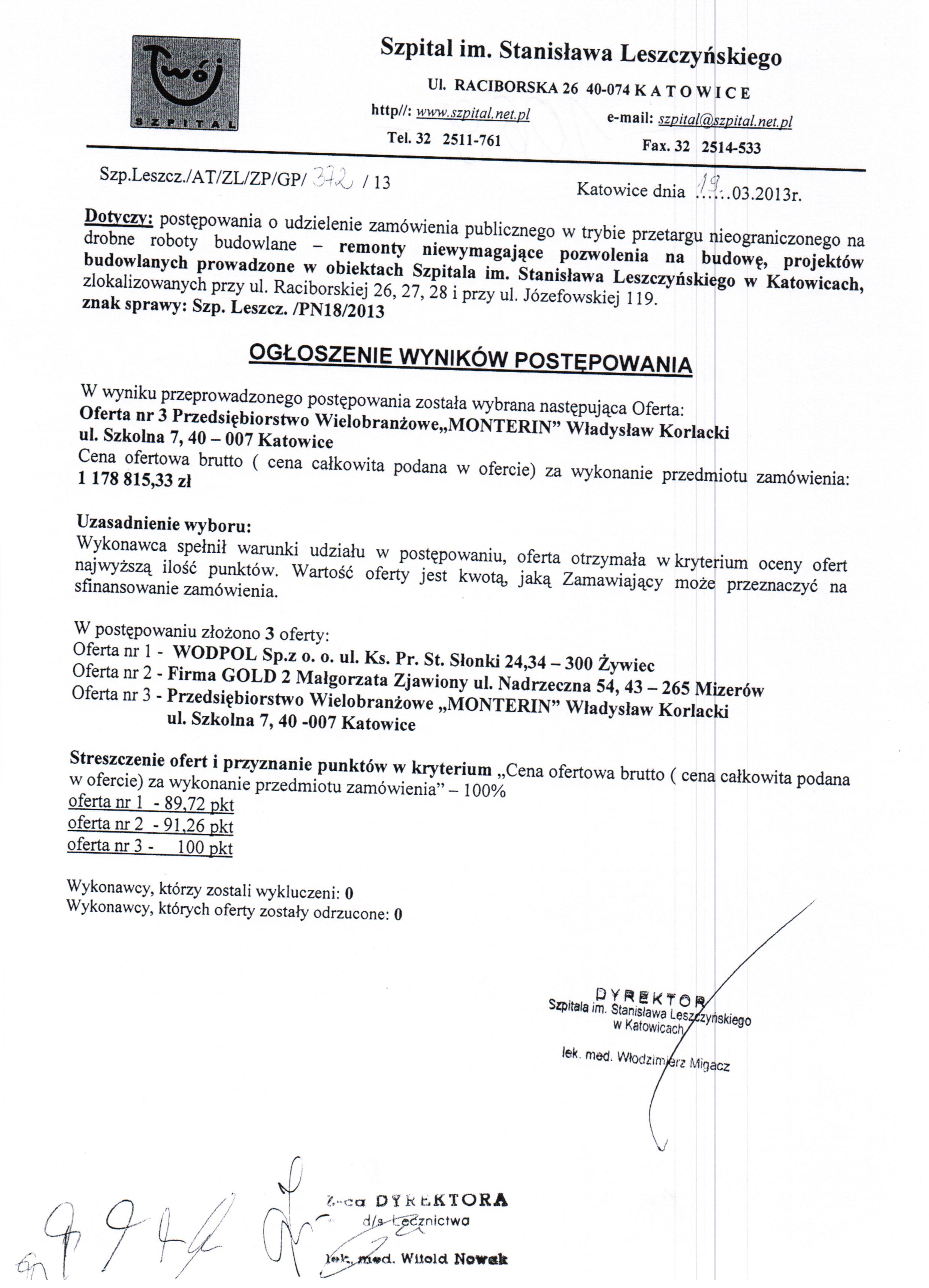 do dnia 21.02.2013r. do godz. 10:00 w Szpitalu im. Stanisława Leszczyńskiego w Katowicach ul. Raciborska 26 – Kancelaria Dyrektora, I piętro.