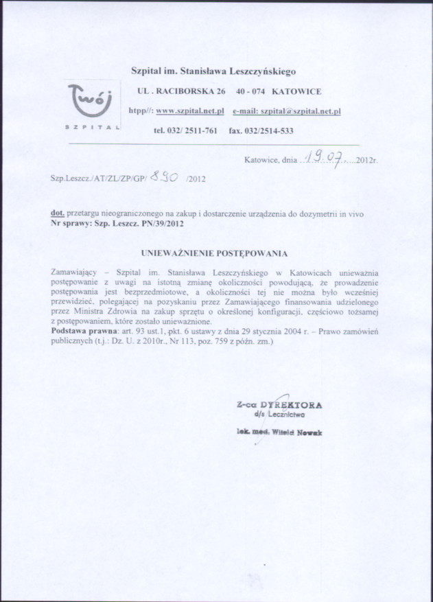 Osoba upoważniona do udzielania informacji - lek. med. Witold Nowak – Z-ca Dyrektora ds. Lecznictwa