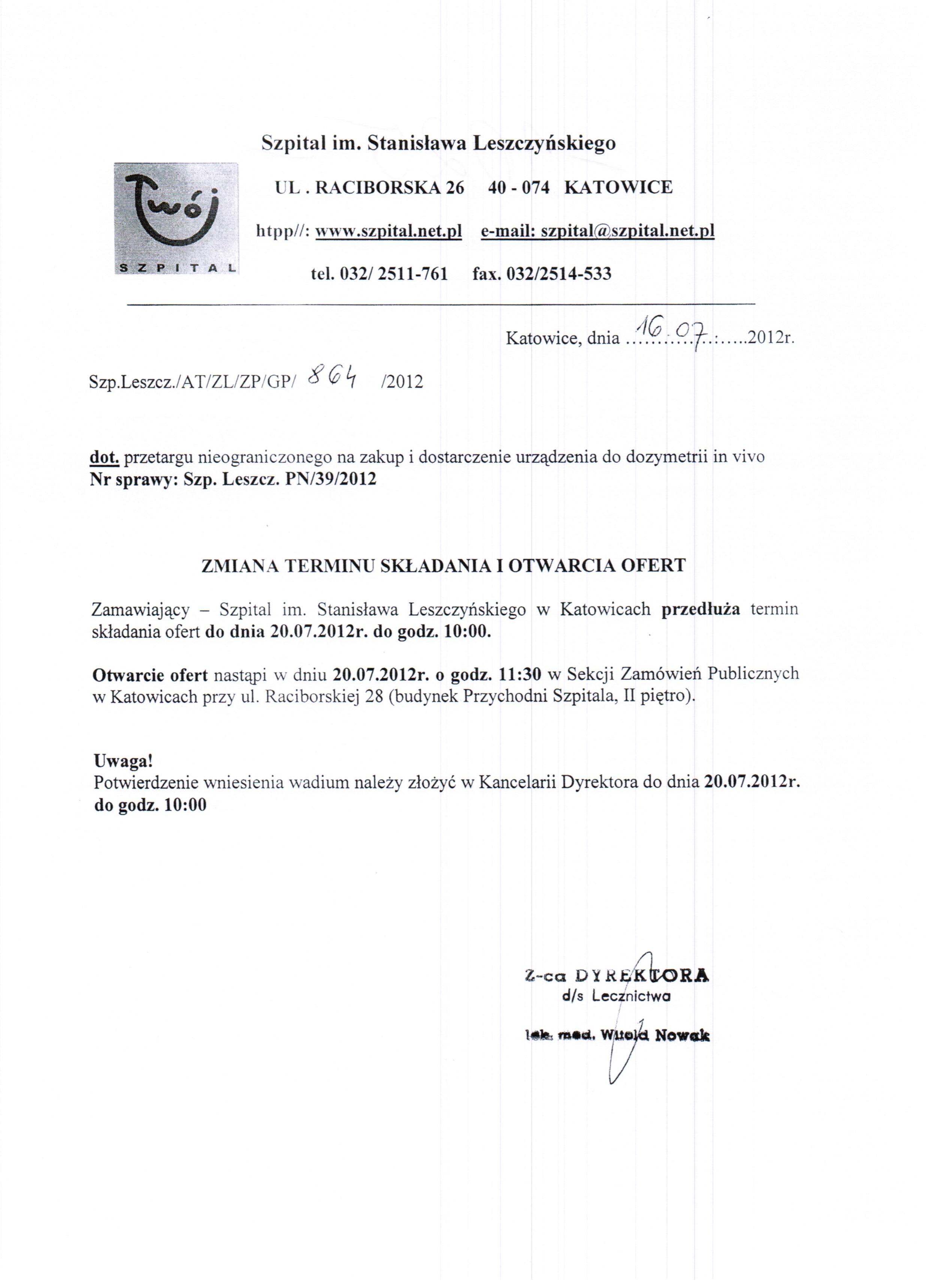 w dniu 18.07.2012r. o godz. 11:00 w 40-074 Katowice, ulica Raciborska 28, budynek Przychodni, II piętro, Sekcja Zamówień Publicznych.
