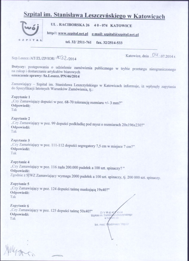 w dniu 09.07.2014r. o godz. 11:00 w 40-074 Katowice, ulica Raciborska 28, budynek Przychodni, II piętro, Sekcja Zamówień Publicznych.