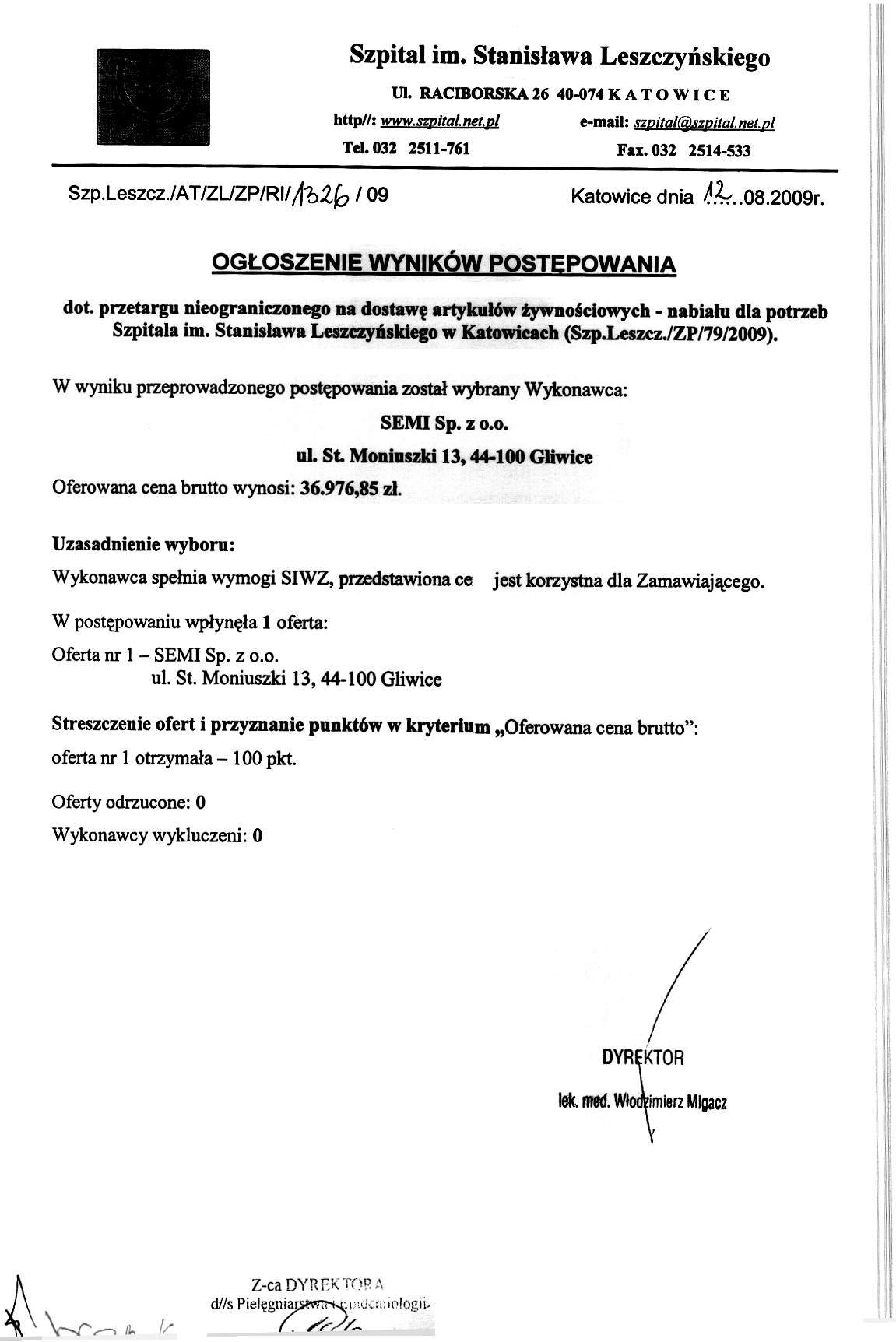 Otwarcie ofert nastąpi w dniu 11.08.2009r. o godz. 11.00 w Sali Konferencyjnej Zakładu Radioterapii w Katowicach przy ul.Raciborskiej 27.