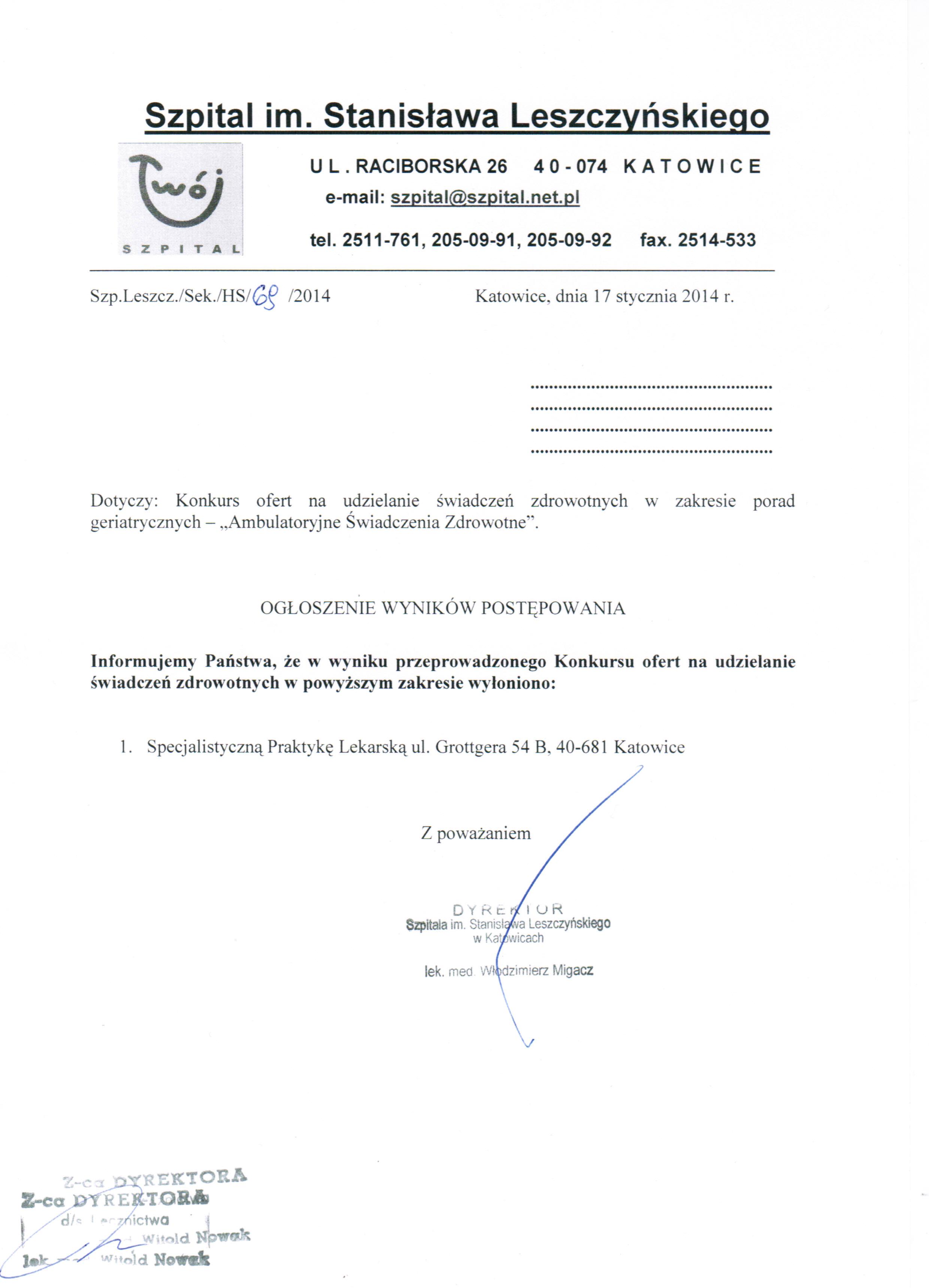 Dodatkowych informacji udziela Z-ca Dyrektora ds. Lecznictwa lek. med. Witold Nowak pod nr tel. (32) 251 17 61.