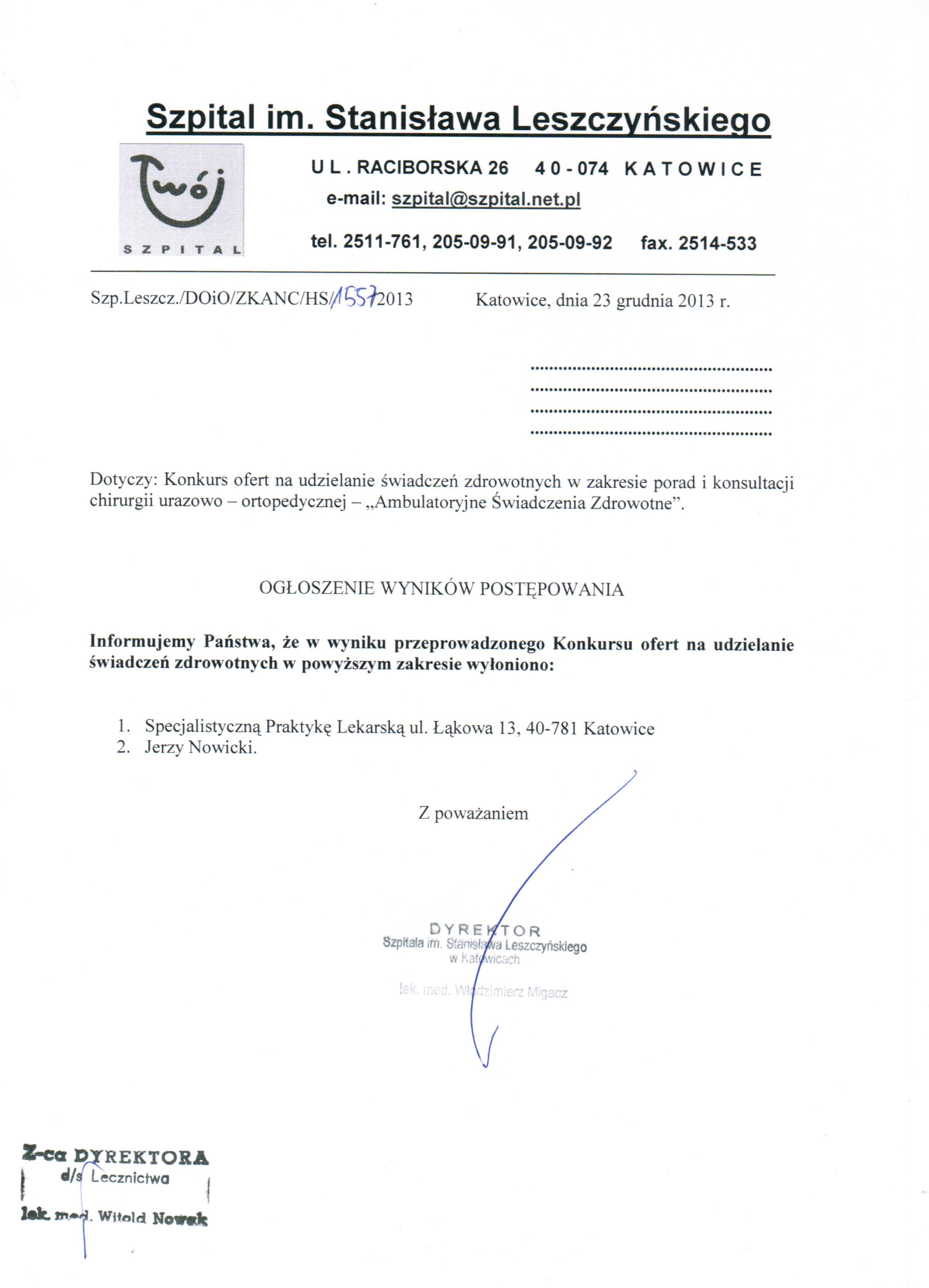 Dodatkowych informacji udziela Z-ca Dyrektora ds. Lecznictwa lek. med. Witold Nowak pod nr tel. (32) 251 17 61.