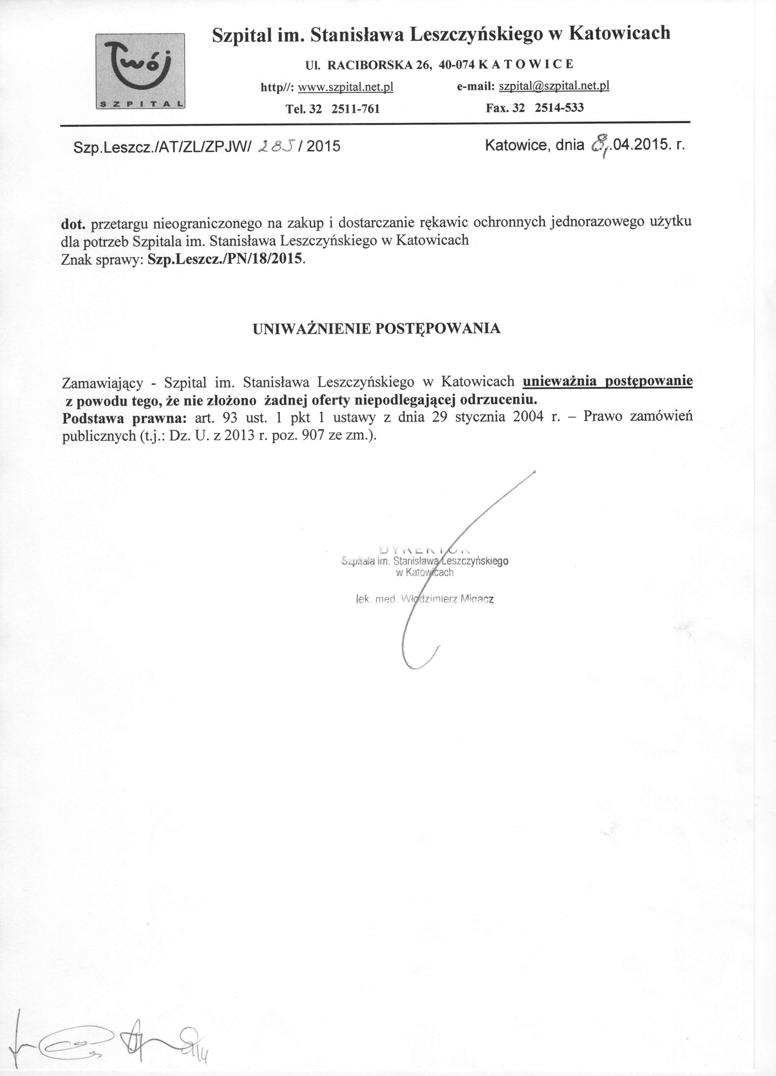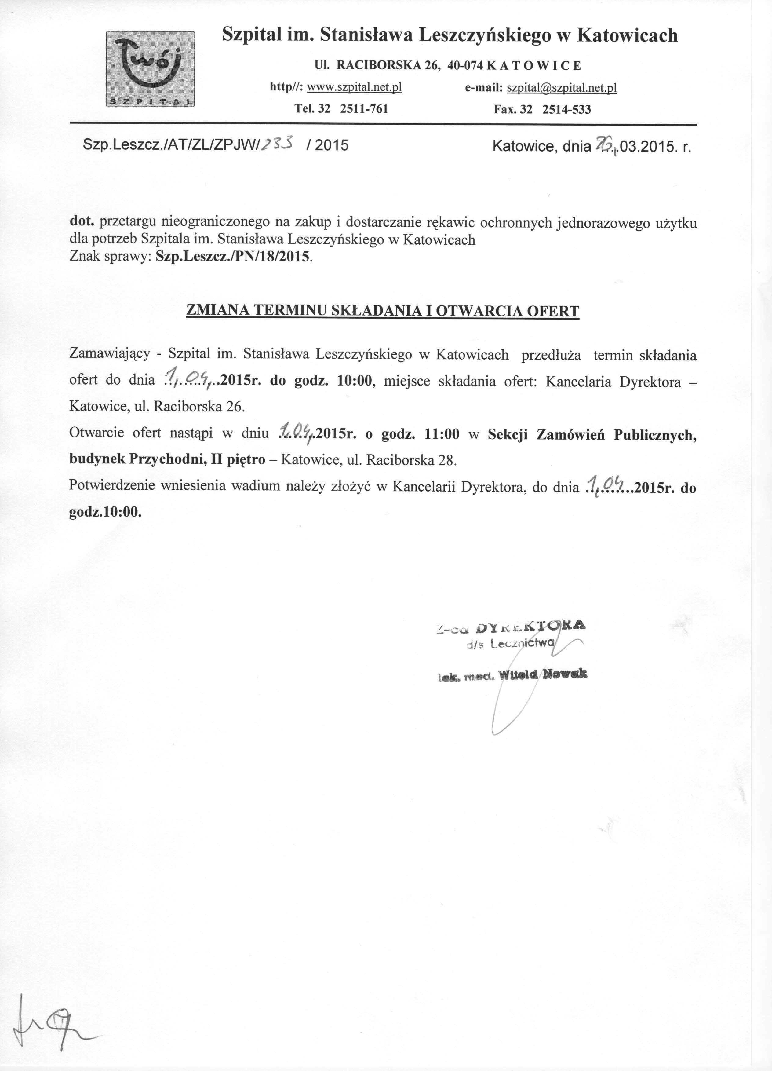 w dniu 30.03.2015 r. o godz. 11:00 w Szpitalu im. Stanisława Leszczyńskiego w Katowicach, ul. Raciborska 28, budynek Przychodni, II piętro, Sekcja Zamówień Publicznych.