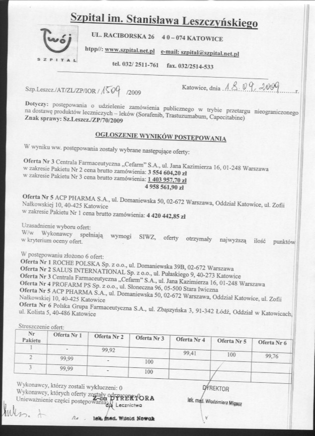 ogłasza przetarg nieograniczony o wartości szacunkowej zamówienia powyżej 206.000 EURO na dostawę produktów leczniczych – leków (Sorafenib, Trastuzumabum, Capecitabine)