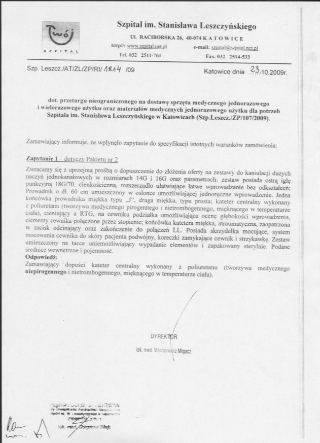 Otwarcie ofert nastąpi w dniu 27.10.2009r. o godz. 11:00 w Sali Konferencyjnej w Zakładzie Radioterapii w Katowicach przy ul. Raciborskiej 27.